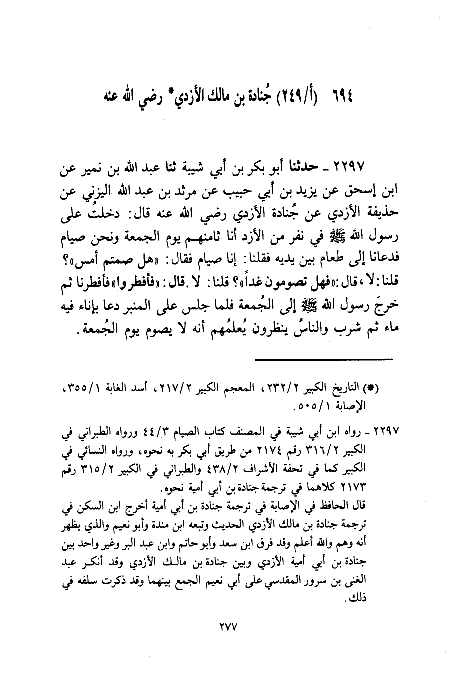 2297 - حَدَّثَنَا أَبُو بَكْرِ بْنُ أَبِي شَيْبَةَ، ثنا عَبْدُ اللَّهِ بْنُ نُمَيْرٍ، عَنِ ابْنِ إِسْحَاقَ، عَنْ يَزِيدَ بْنِ أَبِي حَبِيبٍ، عَنْ مَرْثَدِ بْنِ عَبْدِ اللَّهِ الْيَزَنِيِّ، عَنْ حُذَيْفَةَ الْأَزْدِيِّ، عَنْ جُنَادَةَ الْأَزْدِيِّ، رَضِيَ اللَّهُ عَنْهُ قَالَ: دَخَلْتُ عَلَى رَسُولِ اللَّهِ صَلَّى اللهُ عَلَيْهِ وَسَلَّمَ فِي نَفَرٍ مِنَ الْأَزْدِ أَنَا ثَامِنُهُمْ يَوْمَ الْجُمُعَةِ وَنَحْنُ صِيَامٌ فَدَعَانَا إِلَى طَعَامٍ بَيْنَ يَدَيْهِ فَقُلْنَا إِنَّا صِيَامٌ فَقَالَ: «هَلْ صُمْتُمْ أَمْسِ» قُلْنَا: لَا، قَالَ: «فَهَلْ تَصُومُونَ غَدًا؟» قُلْنَا: لَا، قَالَ: «§فَأَفْطِرُوا» فَأَفْطَرْنَا ثُمَّ خَرَجَ رَسُولُ اللَّهِ صَلَّى اللهُ عَلَيْهِ وَسَلَّمَ إِلَى الْجُمُعَةِ فَلَمَّا جَلَسَ عَلَى الْمِنْبَرِ دَعَا بِإِنَاءٍ فِيهِ مَاءٌ ثُمَّ شَرِبَ وَالنَّاسُ يَنْظُرُونَ يُعْلِمُهُمْ أَنَّهُ لَا يَصُومُ يَوْمَ الْجُمُعَةِ "