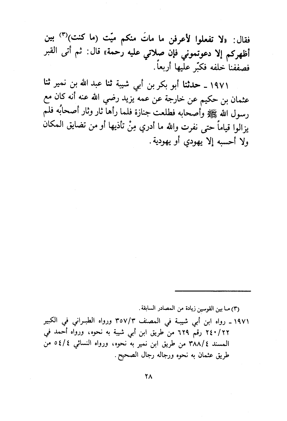 1971 - حَدَّثَنَا أَبُو بَكْرِ بْنُ أَبِي شَيْبَةَ، ثنا عَبْدُ اللَّهِ بْنُ نُمَيْرٍ، ثنا عُثْمَانُ بْنُ حَكِيمٍ، عَنْ خَارِجَةَ، عَنْ عَمِّهِ، يَزِيدَ رَضِيَ اللَّهُ عَنْهُ «§أَنَّهُ كَانَ مَعَ رَسُولِ اللَّهِ صَلَّى اللهُ عَلَيْهِ وَسَلَّمَ وَأَصْحَابِهِ فَطَلَعَتْ جِنَازَةٌ فَلَمَّا رَآهَا ثَارَ، وَثَارَ أَصْحَابُهُ فَلَمْ يَزَالُوا قِيَامًا حَتَّى نَفَرَتْ، وَاللَّهِ مَا أَدْرِي مِنْ تَأَذِّيهَا أَوْ مِنْ تَضَايُقِ الْمَكَانِ، وَلَا أَحْسَبُهُ إِلَّا يَهُودِيًّا أَوْ يَهُودِيَّةً»