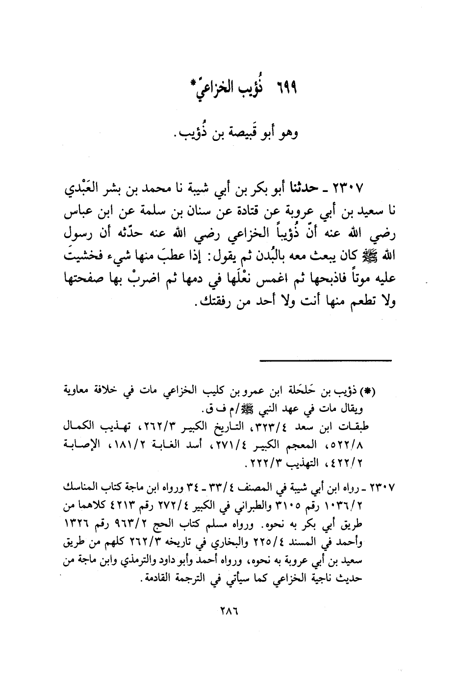 2307 - حَدَّثَنَا أَبُو بَكْرِ بْنُ أَبِي شَيْبَةَ، نا مُحَمَّدُ بْنُ بِشْرٍ الْعَبْدِيُّ، نا سَعِيدُ بْنُ أَبِي عَرُوبَةَ، عَنْ قَتَادَةَ، عَنْ سِنَانِ بْنِ سَلَمَةَ، عَنِ ابْنِ عَبَّاسٍ، رَضِيَ اللَّهُ عَنْهُ أَنَّ ذُؤَيْبًا الْخُزَاعِيَّ رَضِيَ اللَّهُ عَنْهُ حَدَّثَهُ أَنَّ رَسُولَ اللَّهِ صَلَّى اللهُ عَلَيْهِ وَسَلَّمَ كَانَ يَبْعَثُ مَعَهُ بِالْبُدْنِ ثُمَّ يَقُولُ: §إِذَا عَطِبَ مِنْهَا شَيْءٌ فَخَشِيتَ عَلَيْهِ مَوْتًا فَاذْبَحْهَا ثُمَّ اغْمِسْ نَعْلَهَا فِي دَمِهَا، ثُمَّ اضْرِبْ بِهَا صَفْحَتَهَا، وَلَا تَطْعَمْ مِنْهَا أَنْتَ وَلَا أَحَدٌ مِنْ رُفْقَتِكَ "