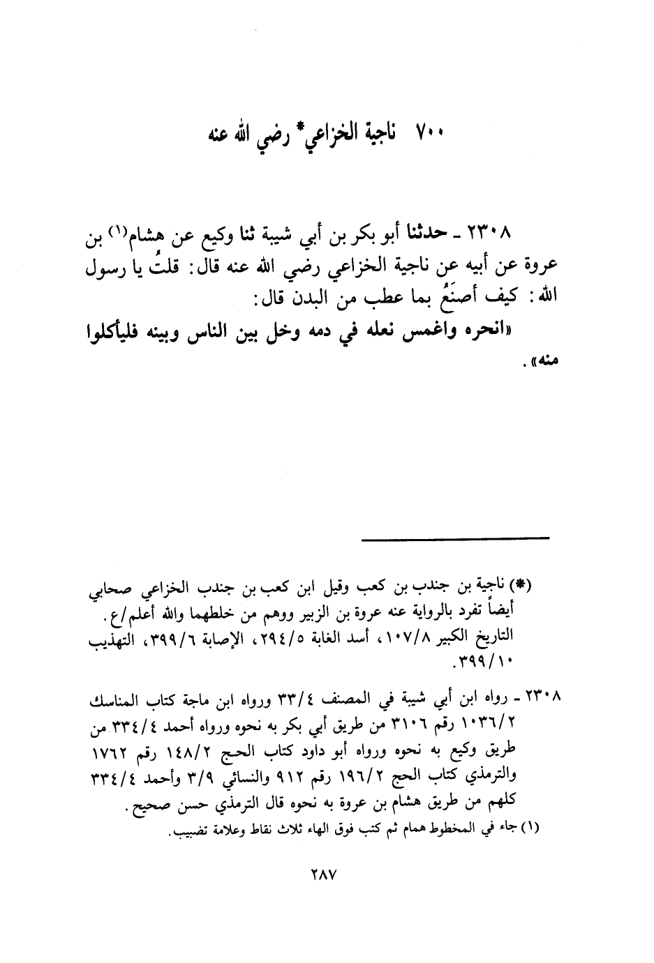 2308 - حَدَّثَنَا أَبُو بَكْرِ بْنُ أَبِي شَيْبَةَ، ثنا وَكِيعٌ، عَنْ هِشَامِ بْنِ عُرْوَةَ، عَنْ أَبِيهِ، عَنْ نَاجِيَةَ الْخُزَاعِيِّ، رَضِيَ اللَّهُ عَنْهُ قَالَ: قُلْتُ يَا رَسُولَ اللَّهِ كَيْفَ أَصْنَعُ بِمَا عَطِبَ مِنَ الْبُدْنِ قَالَ: «§انْحَرْهُ وَاغْمِسْ نَعْلَهُ فِي دَمِهِ وَخَلِّ بَيْنَ النَّاسِ وَبَيْنَهُ فَلْيَأْكُلُوا مِنْهُ»