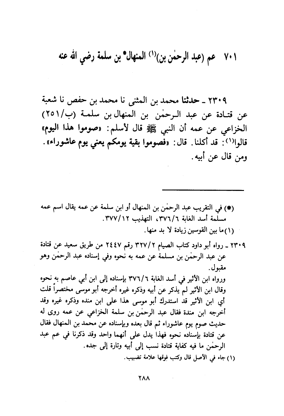 2309 - حَدَّثَنَا مُحَمَّدُ بْنُ الْمُثَنَّى، نا مُحَمَّدُ بْنُ حَفْصٍ، نا شُعْبَةُ، عَنْ قَتَادَةَ، عَنْ عَبْدِ الرَّحْمَنِ بْنِ الْمِنْهَالِ بْنِ سَلَمَةَ الْخُزَاعِيِّ، عَنْ عَمِّهِ، أَنَّ النَّبِيَّ صَلَّى اللهُ عَلَيْهِ وَسَلَّمَ قَالَ لِأَسْلَمَ: «§صُومُوا هَذَا الْيَوْمَ» قَالُوا: قَدْ أَكَلْنَا، قَالَ: «فَصُومُوا بَقِيَّةَ يَوْمِكُمْ يَعْنِي يَوْمَ عَاشُورَاءَ» وَمَنْ قَالَ عَنْ أَبِيهِ