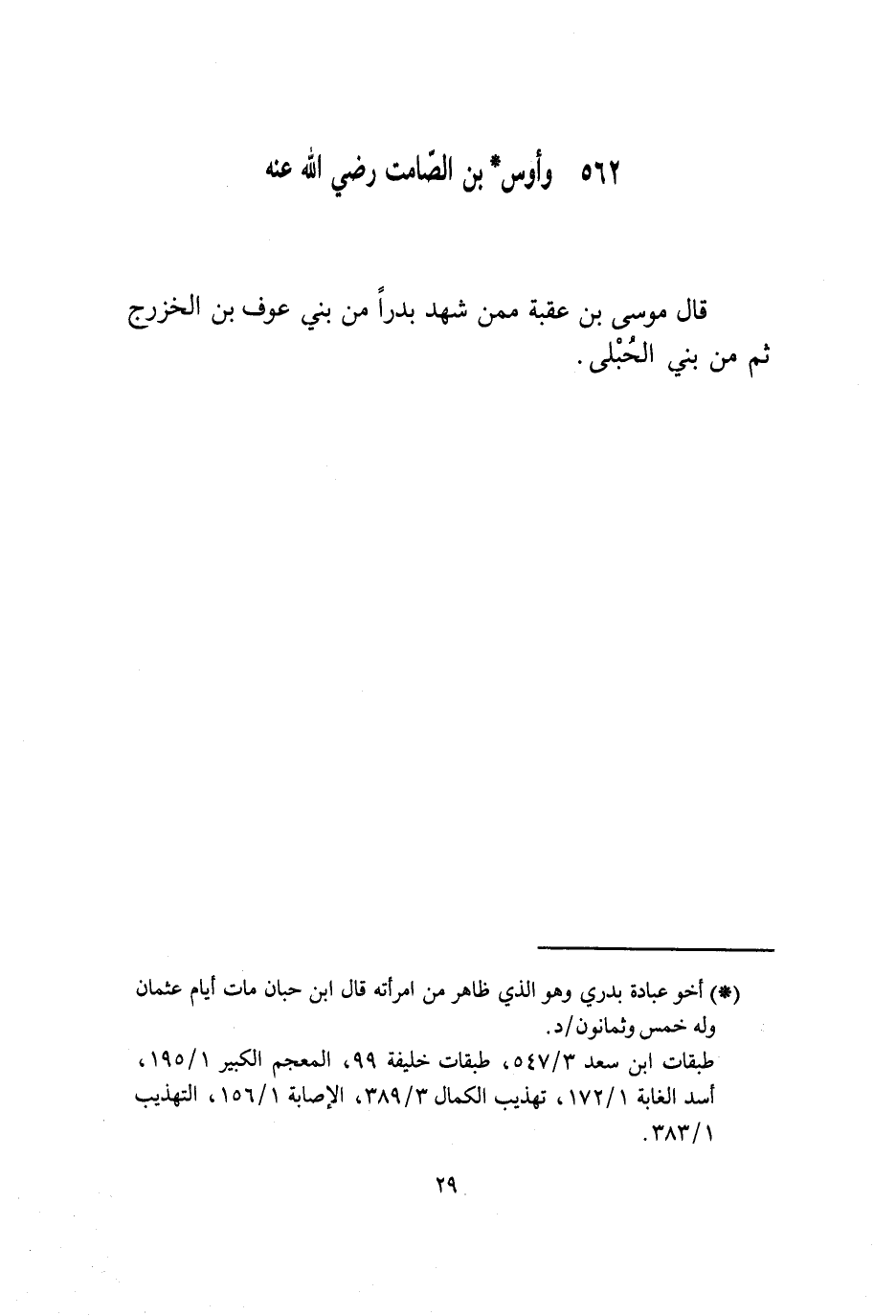 §وَأَوْسُ بْنُ الصَّامِتِ رَضِيَ اللَّهُ عَنْهُ. قَالَ مُوسَى بْنُ عُقْبَةَ مِمَّنْ شَهِدَ بَدْرًا مِنْ بَنِي عَوْفِ بْنِ الْخَزْرَجِ ثُمَّ مِنْ بَنِي الْحُبْلَى