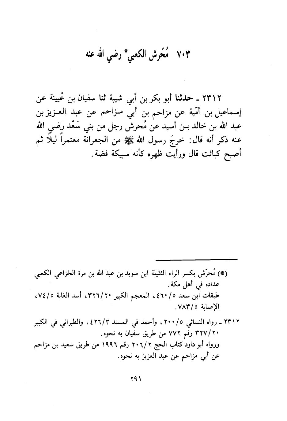 2312 - حَدَّثَنَا أَبُو بَكْرِ بْنُ أَبِي شَيْبَةَ، ثنا سُفْيَانُ بْنُ عُيَيْنَةَ، عَنْ إِسْمَاعِيلَ بْنِ أُمَيَّةَ، عَنْ مُزَاحِمِ بْنِ أَبِي مُزَاحِمٍ، عَنْ عَبْدِ الْعَزِيزِ بْنِ عَبْدِ اللَّهِ بْنِ خَالِدِ بْنِ أُسَيْدٍ، عَنْ مُحَرِّشٍ، رَجُلٍ مِنْ بَنِي سَعْدٍ رَضِيَ اللَّهُ عَنْهُ ذَكَرَ أَنَّهُ قَالَ: §خَرَجَ رَسُولُ اللَّهِ صَلَّى اللهُ عَلَيْهِ وَسَلَّمَ مِنَ الْجِعْرَانَةِ مُعْتَمِرًا لَيْلًا ثُمَّ أَصْبَحَ كَبَائِتٍ قَالَ: وَرَأَيْتُ ظَهْرَهُ كَأَنَّهُ سَبِيكَةُ فِضَّةٍ "