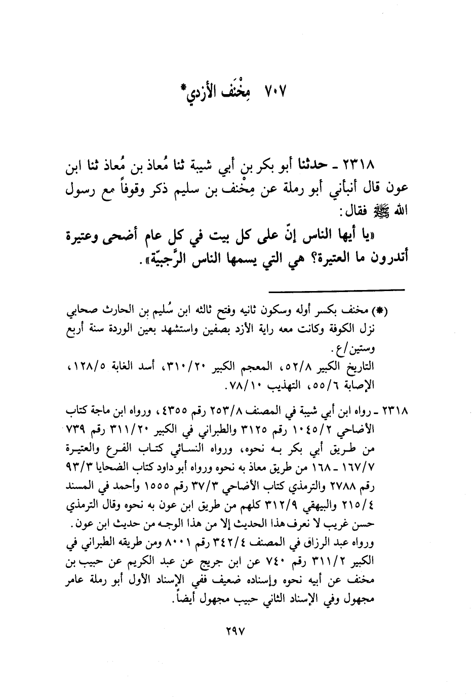 2318 - حَدَّثَنَا أَبُو بَكْرِ بْنُ أَبِي شَيْبَةَ، ثنا مُعَاذُ بْنُ مُعَاذٍ، ثنا ابْنُ عَوْنٍ، قَالَ: أَنْبَأَنِي أَبُو رَمْلَةَ، عَنْ مِخْنَفِ بْنِ سُلَيْمٍ، ذَكَرَ وُقُوفًا مَعَ رَسُولِ اللَّهِ صَلَّى اللهُ عَلَيْهِ وَسَلَّمَ فَقَالَ: «§يَا أَيُّهَا النَّاسُ إِنَّ عَلَى كُلِّ بَيْتٍ فِي كُلِّ عَامٍ أَضْحًى وَعَتِيرَةً أَتَدْرُونَ مَا الْعَتِيرَةُ؟ هِيَ الَّتِي يُسَمِّهَا النَّاسُ الرَّجَبِيَّةَ»