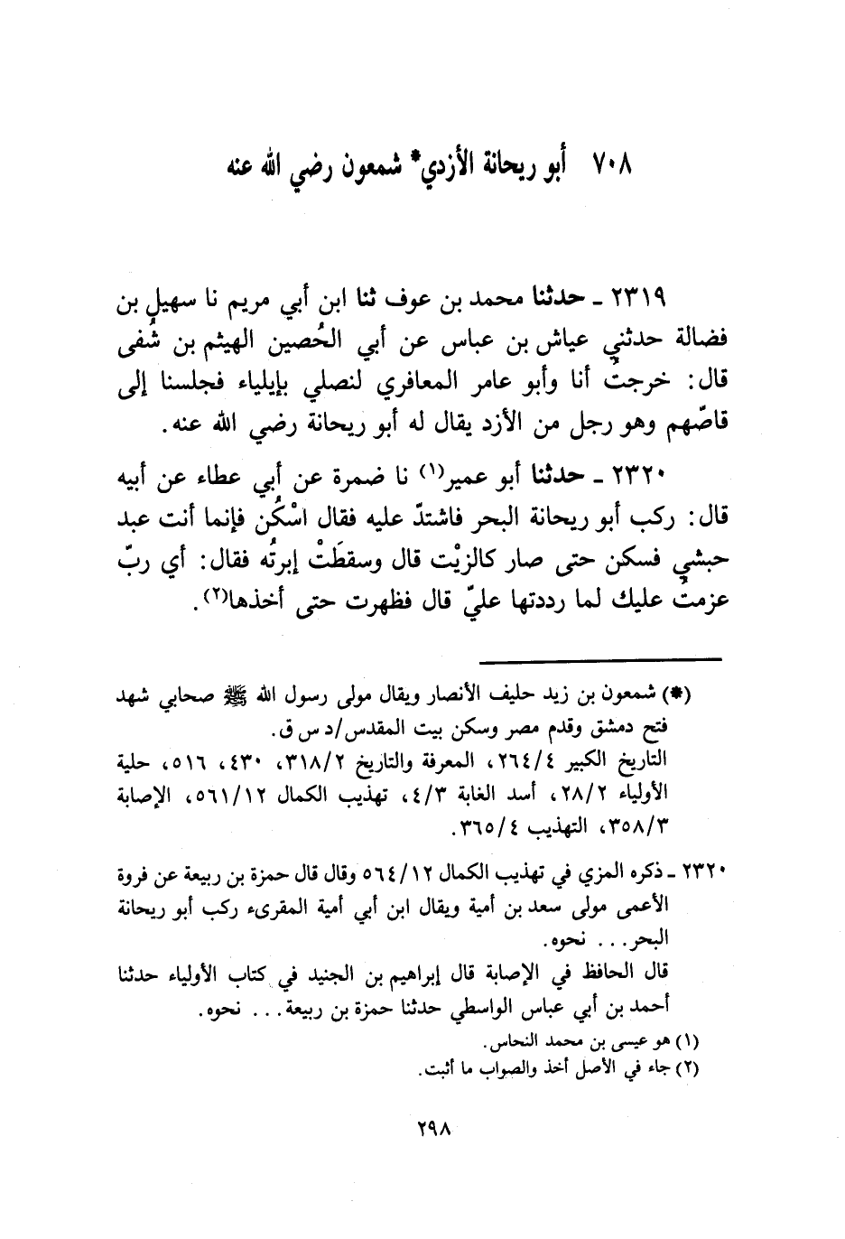 2320 - حَدَّثَنَا أَبُو عُمَيْرٍ، نا ضَمْرَةُ، عَنْ أَبِي عَطَاءٍ، عَنْ أَبِيهِ، قَالَ: رَكَبَ أَبُو رَيْحَانَةَ الْبَحْرَ فَاشْتَدَّ عَلَيْهِ فَقَالَ: §اسْكُنْ فَإِنَّمَا أَنْتَ عَبْدٌ حَبَشِيٌّ فَسَكَنَ حَتَّى صَارَ كالزَّيْتِ قَالَ: وَسَقَطَتْ إِبْرَتُهُ فَقَالَ: أَيْ رَبِّ عَزَمْتُ عَلَيْكَ لَمَّا رَدَدْتُهَا عَلَيَّ قَالَ: فَظَهَرَتْ حَتَّى أَخَذَهَا "