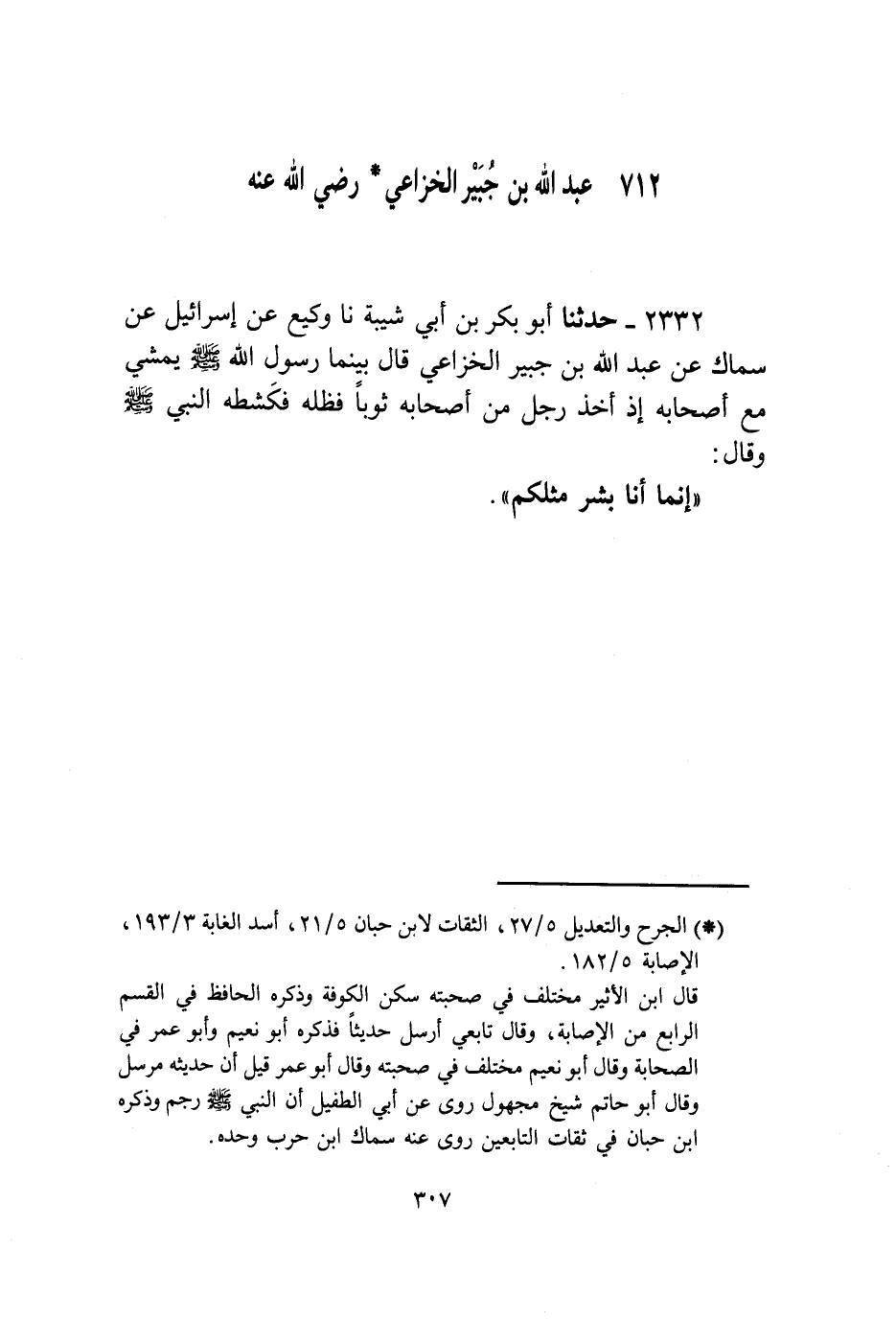 2332 - حَدَّثَنَا أَبُو بَكْرِ بْنُ أَبِي شَيْبَةَ، نا وَكِيعٌ، عَنْ إِسْرَائِيلَ، عَنْ سِمَاكٍ، عَنْ عَبْدِ اللَّهِ بْنِ جُبَيْرٍ الْخُزَاعِيِّ، قَالَ: " §بَيْنَمَا رَسُولُ اللَّهِ صَلَّى اللهُ عَلَيْهِ وَسَلَّمَ يَمْشِي مَعَ أَصْحَابِهِ إِذْ أَخَذَ رَجُلٌ مِنْ أَصْحَابِهِ ثَوْبًا فَظَلَّهُ فَكَشَطَهُ النَّبِيُّ صَلَّى اللهُ عَلَيْهِ وَسَلَّمَ وَقَالَ: «إِنَّمَا أَنَا بَشَرٌ مِثْلُكُمْ»