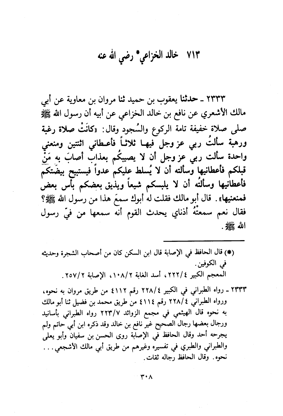 2333 - حَدَّثَنَا يَعْقُوبُ بْنُ حُمَيْدٍ، ثنا مَرْوَانُ بْنُ مُعَاوِيَةَ، عَنْ أَبِي مَالِكٍ الْأَشْعَرِيِّ، عَنْ نَافِعِ بْنِ خَالِدٍ الْخُزَاعِيِّ، عَنْ أَبِيهِ، " أَنَّ رَسُولَ اللَّهِ صَلَّى اللهُ عَلَيْهِ وَسَلَّمَ صَلَّى صَلَاةً خَفِيفَةً تَامَّةَ الرُّكُوعِ وَالسُّجُودِ وَقَالَ: «§كَانَتْ صَلَاةُ رَغْبَةٍ وَرَهْبَةٍ سَأَلْتُ رَبِّي عَزَّ وَجَلَّ فِيهَا ثَلَاثًا فَأَعْطَانِي اثْنَتَيْنِ وَمَنَعَنِي وَاحِدَةً سَأَلْتُ رَبِّي عَزَّ وَجَلَّ أَنْ لَا يُصِيبَكُمْ بِعَذَابٍ أَصَابَ بِهِ مَنْ قَبْلَكُمْ فَأَعْطَانِيهَا، وَسَأَلْتُهُ أَنْ لَا يُسَلِّطَ عَلَيْكُمْ عَدُوًّا فَيَسْتَبِيحَ بَيْضَتَكُمْ فَأَعْطَانِيهَا، وَسَأَلْتُهُ أَنْ لَا يَلْبِسَكُمْ شِيَعًا وَيُذِيقَ بَعْضَكُمْ بَأْسَ بَعْضٍ فَمَنَعَنِيهَا» قَالَ أَبُو مَالِكٍ: فَقُلْتُ لَهُ أَبُوكَ سَمِعَ هَذَا مِنْ رَسُولِ اللَّهِ صَلَّى اللهُ عَلَيْهِ وَسَلَّمَ؟ فَقَالَ: نَعَمْ سَمِعَتْهُ أُذُنَايَ يُحَدِّثُ الْقَوْمَ أَنَّهُ سَمِعَهَا مِنْ فِي رَسُولِ اللَّهِ صَلَّى اللهُ عَلَيْهِ وَسَلَّمَ "