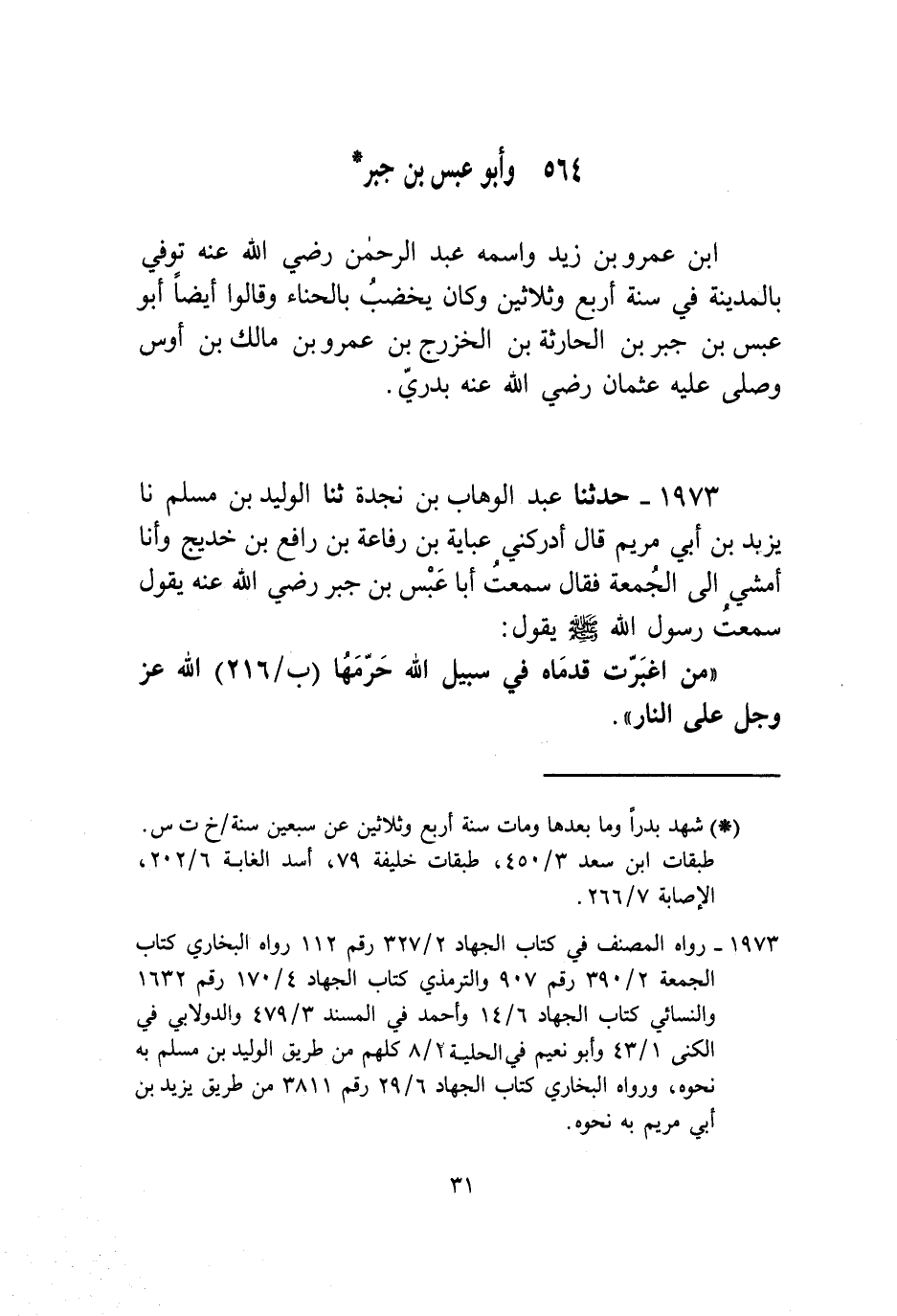 1973 - حَدَّثَنَا عَبْدُ الْوَهَّابِ بْنُ نَجْدَةَ، ثنا الْوَلِيدُ بْنُ مُسْلِمٍ، نا يَزِيدُ بْنُ أَبِي مَرْيَمَ، قَالَ: أَدْرَكَنِي عَبَايَةُ بْنُ رِفَاعَةَ بْنِ رَافِعِ بْنِ خَدِيجٍ وَأَنَا، أَمْشِي، إِلَى الْجُمُعَةِ فَقَالَ: سَمِعْتُ أَبَا عَبْسِ بْنَ جَبْرٍ، رَضِيَ اللَّهُ عَنْهُ يَقُولُ سَمِعْتُ رَسُولَ اللَّهِ صَلَّى اللهُ عَلَيْهِ وَسَلَّمَ يَقُولُ: «§مَنِ اغْبَرَّتْ قَدَمَاهُ فِي سَبِيلِ اللَّهِ حَرَّمَهَا اللَّهُ عَزَّ وَجَلَّ عَلَى النَّارِ»