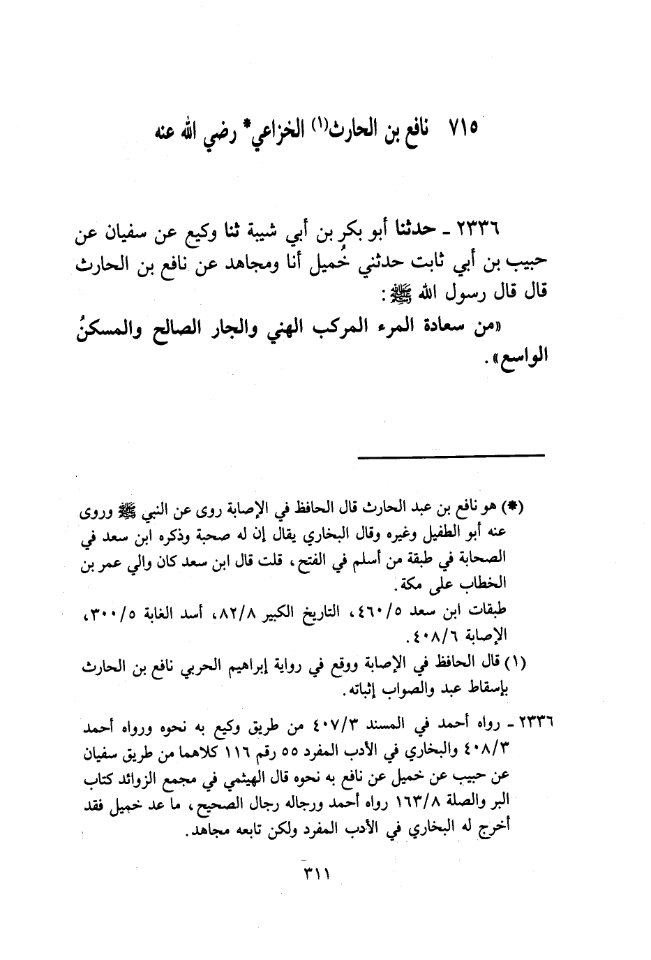 2336 - حَدَّثَنَا أَبُو بَكْرِ بْنُ أَبِي شَيْبَةَ، ثنا وَكِيعٌ، عَنْ سُفْيَانَ، عَنْ حَبِيبِ بْنِ أَبِي ثَابِتٍ، حَدَّثَنِي خُمَيْلٌ، أنا وَمُجَاهِدٌ، عَنْ نَافِعِ بْنِ الْحَارِثِ، قَالَ: قَالَ رَسُولُ اللَّهِ صَلَّى اللهُ عَلَيْهِ وَسَلَّمَ: «§مِنْ سَعَادَةِ الْمَرْءِ الْمَرْكَبُ الْهَنِيُّ، وَالْجَارُ الصَّالِحُ، وَالْمَسْكَنُ الْوَاسِعُ»