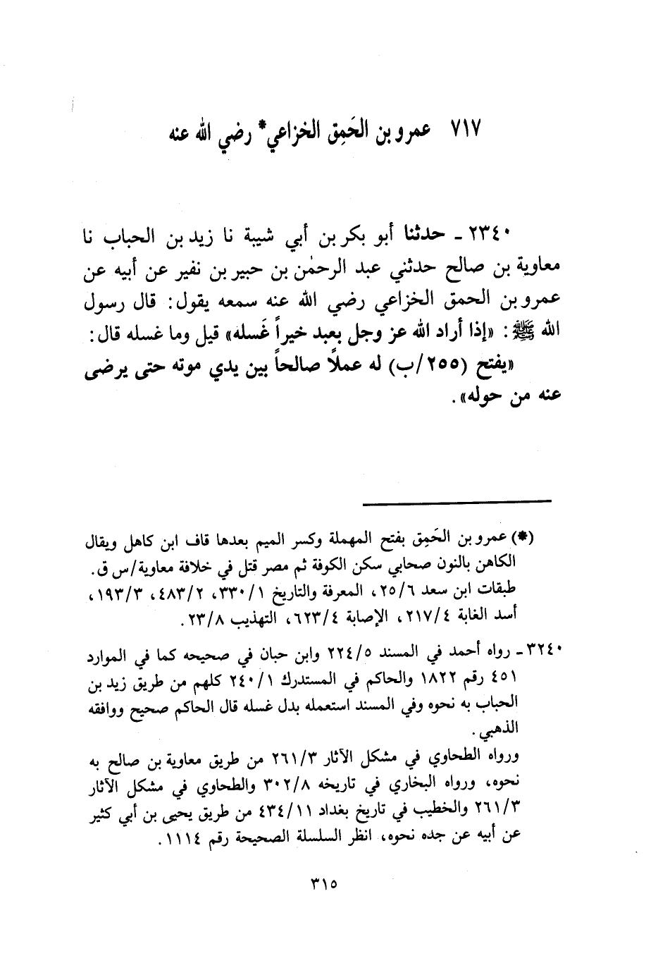 2340 - حَدَّثَنَا، أَبُو بَكْرِ بْنُ أَبِي شَيْبَةَ، نا، زَيْدُ بْنُ الْحُبَابِ، نا مُعَاوِيَةُ بْنُ صَالِحٍ، حَدَّثَنِي عَبْدُ الرَّحْمَنِ بْنُ جُبَيْرِ بْنِ نُفَيْرٍ، عَنْ، أَبِيهِ، عَنْ، عَمْرِو بْنِ الْحَمِقِ الْخُزَاعِيِّ، رَضِيَ اللَّهُ عَنْهُ سَمِعَهُ يَقُولُ: قَالَ رَسُولُ اللَّهِ صَلَّى اللهُ عَلَيْهِ وَسَلَّمَ: «§إِذَا أَرَادَ اللَّهُ عَزَّ وَجَلَّ بِعَبْدٍ خَيْرًا عَسَّلَهُ» قِيلَ وَمَا عَسَّلَهُ؟ قَالَ: «يَفْتَحُ لَهُ عَمَلًا صَالِحًا بَيْنَ يَدَيْ مَوْتِهِ حَتَّى يَرْضَى عَنْهُ مَنْ حَوْلَهُ»