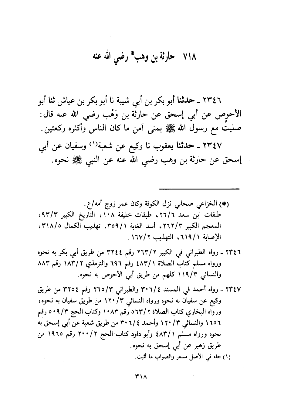 2346 - حَدَّثَنَا أَبُو بَكْرِ بْنُ أَبِي شَيْبَةَ، نا أَبُو بَكْرِ بْنُ عَيَّاشٍ، ثنا أَبُو الْأَحْوَصِ، عَنْ أَبِي إِسْحَاقَ، عَنْ حَارِثَةَ بْنِ وَهْبٍ، رَضِيَ اللَّهُ عَنْهُ قَالَ: «§صَلَّيْتُ مَعَ رَسُولِ اللَّهِ صَلَّى اللهُ عَلَيْهِ وَسَلَّمَ بِمِنًى آمَنَ مَا كَانَ النَّاسُ وَأَكْثَرُهُ رَكْعَتَيْنِ»