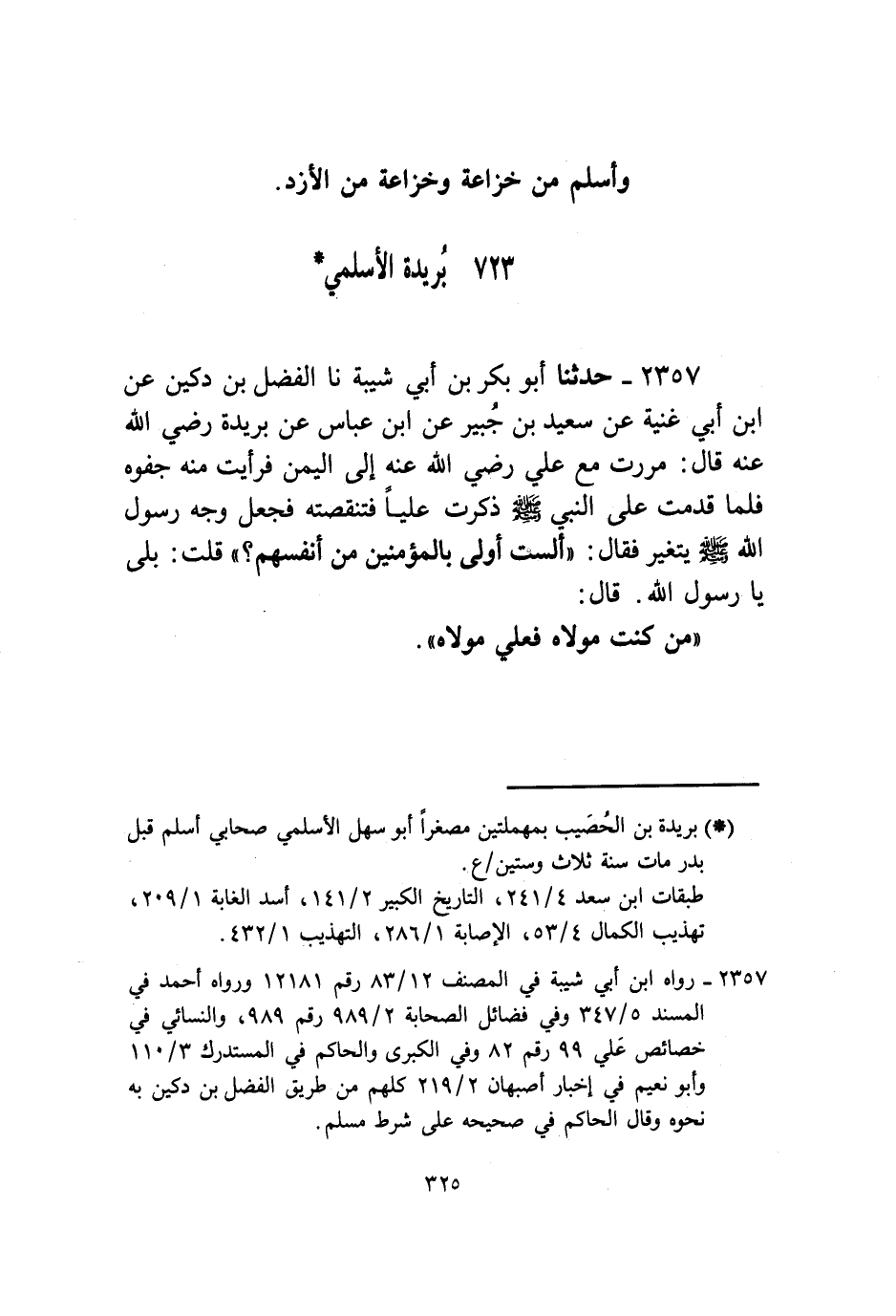 2357 - حَدَّثَنَا أَبُو بَكْرِ بْنُ أَبِي شَيْبَةَ، نا الْفَضْلُ بْنُ دُكَيْنٍ، عَنِ ابْنِ أَبِي غَنِيَّةَ، عَنْ سَعِيدِ بْنِ جُبَيْرٍ، عَنِ ابْنِ عَبَّاسٍ، عَنْ بُرَيْدَةَ، رَضِيَ اللَّهُ عَنْهُ قَالَ: " مَرَرْتُ مَعَ عَلِيٍّ رَضِيَ اللَّهُ عَنْهُ إِلَى الْيَمَنِ فَرَأَيْتُ مِنْهُ جَفْوَةً فَلَمَّا قَدِمْتُ عَلَى النَّبِيِّ صَلَّى اللهُ عَلَيْهِ وَسَلَّمَ ذَكَرْتُ عَلِيًّا فَتَنَقَّصْتُهُ فَجَعَلَ وَجْهُ رَسُولِ اللَّهِ صَلَّى اللهُ عَلَيْهِ وَسَلَّمَ يَتَغَيَّرُ فَقَالَ: «§أَلَسْتُ أَوْلَى بِالْمُؤْمِنِينَ مِنْ أَنْفُسِهِمْ؟» قُلْتُ: بَلَى يَا رَسُولَ اللَّهِ قَالَ: «مَنْ كُنْتُ مَوْلَاهُ فَعَلِيٌّ مَوْلَاهُ»