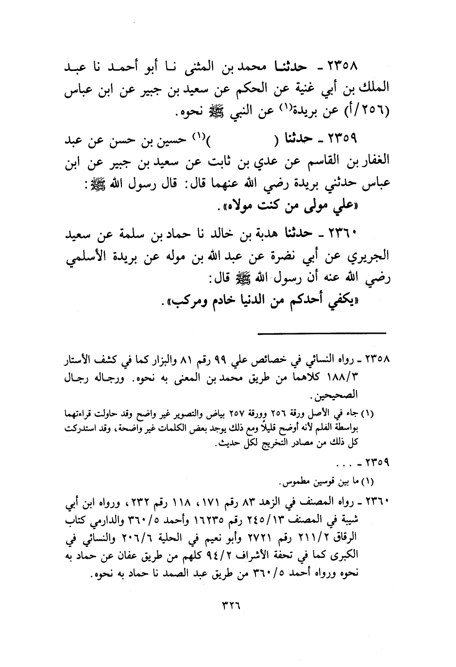 2359 - حَدَّثَنَا حُسَيْنُ بْنُ حَسَنٍ، عَنْ عَبْدِ الْغَفَّارِ بْنِ الْقَاسِمِ، عَنْ عَدِيِّ بْنِ ثَابِتٍ، عَنْ سَعِيدِ بْنِ جُبَيْرٍ، عَنِ ابْنِ عَبَّاسٍ، حَدَّثَنِي بُرَيْدَةُ، رَضِيَ اللَّهُ عَنْهُمَا قَالَ: قَالَ رَسُولُ اللَّهِ صَلَّى اللهُ عَلَيْهِ وَسَلَّمَ «§عَلِيٌّ مَوْلَى مَنْ كُنْتُ مَوْلَاهُ»
