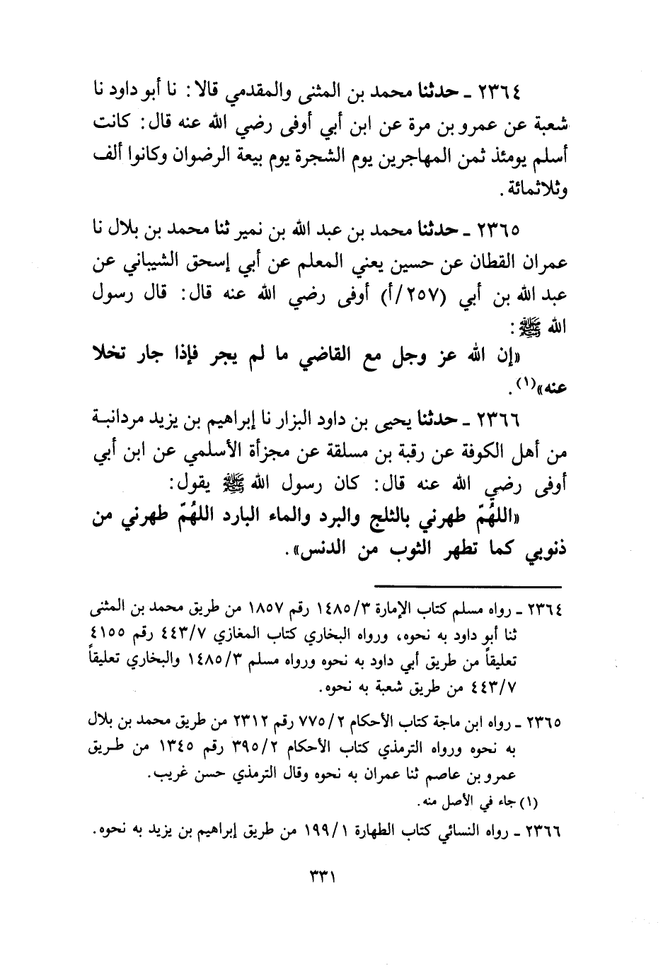 2366 - حَدَّثَنَا، يَحْيَى بْنُ دَاوُدَ الَبَّزَّارُ، نا، إِبْرَاهِيمُ بْنُ يَزِيدَ مِرْدَانْبَةَ مِنْ أَهْلِ الْكُوفَةِ عَنْ رَقَبَةَ بْنِ مَسْقَلَةَ، عَنْ مَجْزَأَةَ الْأَسْلَمِيِّ، عَنِ ابْنِ أَبِي أَوْفَى، رَضِيَ اللَّهُ عَنْهُ قَالَ: كَانَ رَسُولُ اللَّهِ صَلَّى اللهُ عَلَيْهِ وَسَلَّمَ يَقُولُ: «§اللَّهُمَّ طَهِّرْنِي بِالثَّلْجِ وَالْبَرَدِ وَالْمَاءِ الْبَارِدِ اللَّهُمَّ طَهِّرْنِي مِنْ ذُنُوبِي كَمَا تُطَهِّرُ الثَّوْبَ مِنَ الدَّنَسِ»