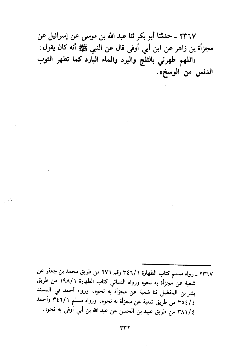 2367 - حَدَّثَنَا أَبُو بَكْرٍ، ثنا عُبَيْدُ اللَّهِ بْنُ مُوسَى، عَنْ إِسْرَائِيلَ، عَنْ مَجْزَأَةَ بْنِ زَاهِرٍ، عَنِ ابْنِ أَبِي أَوْفَى، قَالَ: عَنِ النَّبِيِّ، صَلَّى اللهُ عَلَيْهِ وَسَلَّمَ أَنَّهُ كَانَ يَقُولُ: «§اللَّهُمَّ طَهِّرْنِي بِالثَّلْجِ وَالْبَرَدِ وَالْمَاءِ الْبَارِدِ كَمَا تُطَهِّرُ الثَّوْبَ الدَّنِسَ مِنَ الْوَسَخِ»