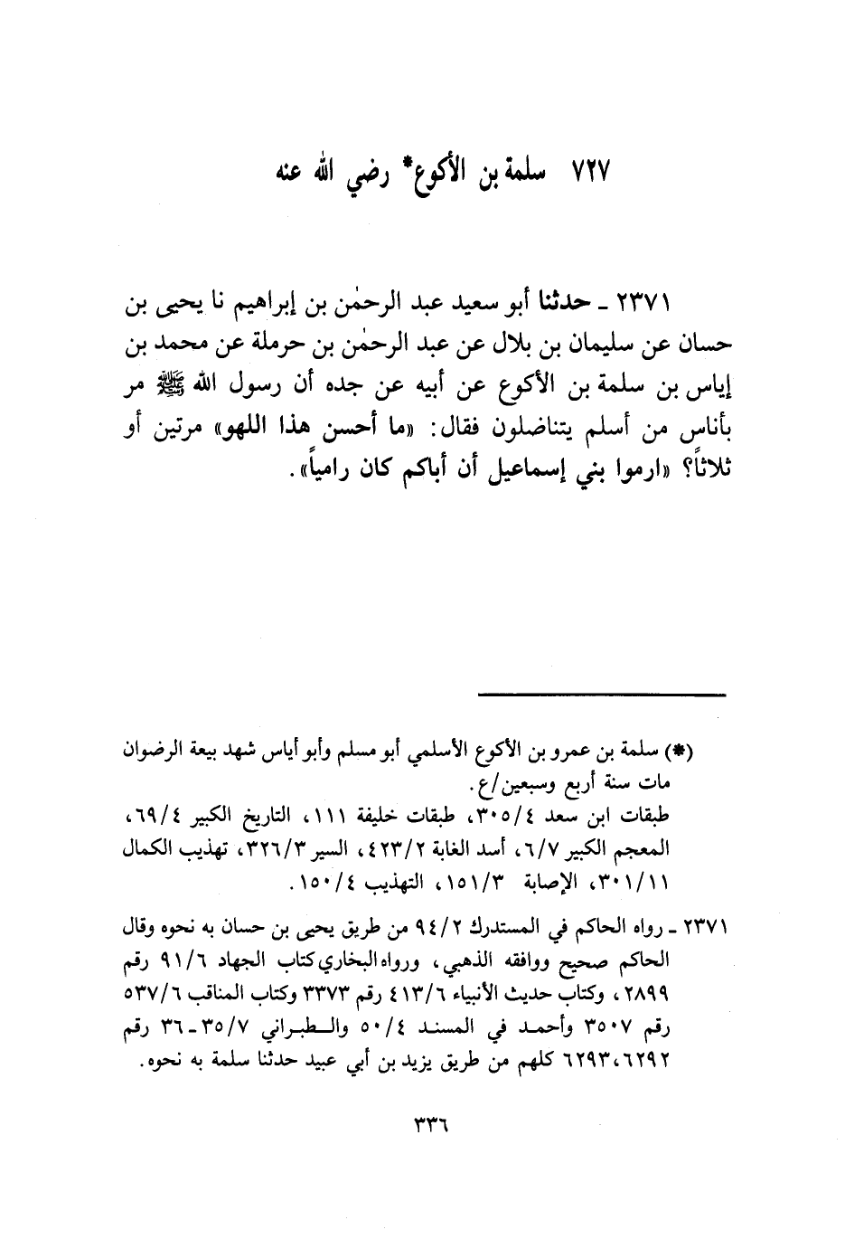 2371 - حَدَّثَنَا أَبُو سَعِيدٍ عَبْدُ الرَّحْمَنِ بْنُ إِبْرَاهِيمَ، نا يَحْيَى بْنُ حَسَّانَ، عَنْ سُلَيْمَانَ بْنِ بِلَالٍ، عَنْ عَبْدِ الرَّحْمَنِ بْنِ حَرْمَلَةَ، عَنْ مُحَمَّدِ بْنِ إِيَاسِ بْنِ سَلَمَةَ بْنِ الْأَكْوَعِ، عَنْ أَبِيهِ، عَنْ جَدِّهِ، أَنَّ رَسُولَ اللَّهِ صَلَّى اللهُ عَلَيْهِ وَسَلَّمَ مَرَّ بِأُنَاسٍ مِنْ أَسْلَمَ يَتَنَاضَلُونَ فَقَالَ: «§مَا أَحْسَنَ هَذَا اللَّهْوَ» مَرَّتَيْنِ أَوْ ثَلَاثًا «ارْمُوا بَنِي إِسْمَاعِيلَ إِنَّ أَبَاكُمْ كَانَ رَامِيًا»