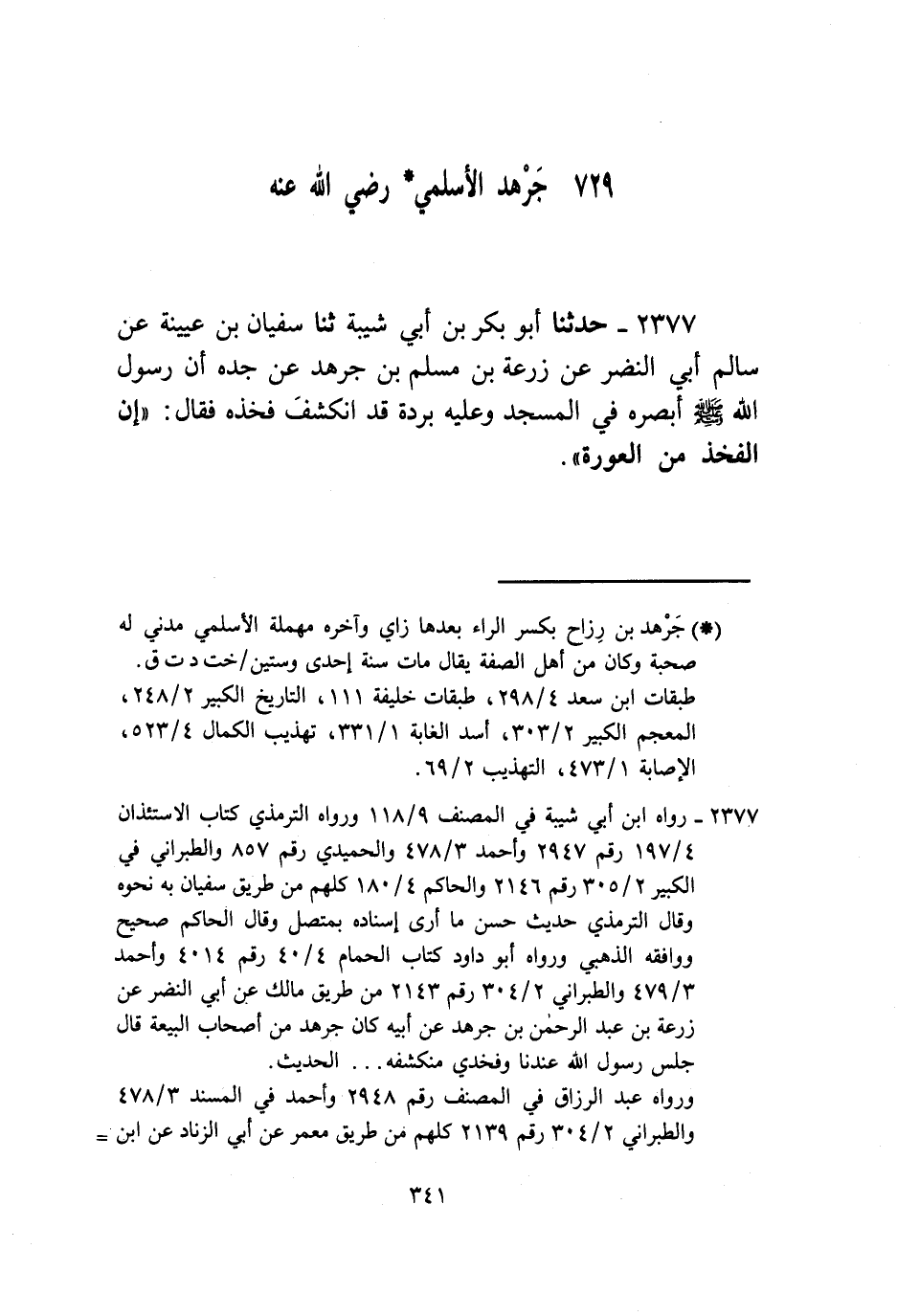 2377 - حَدَّثَنَا أَبُو بَكْرِ بْنُ أَبِي شَيْبَةَ، ثنا سُفْيَانُ بْنُ عُيَيْنَةَ، عَنْ سَالِمٍ أَبِي النَّضْرِ، عَنْ زُرْعَةَ بْنِ مُسْلِمِ بْنِ جَرْهَدٍ، عَنْ جَدِّهِ، أَنَّ رَسُولَ اللَّهِ صَلَّى اللهُ عَلَيْهِ وَسَلَّمَ أَبْصَرَهُ فِي الْمَسْجِدِ وَعَلَيْهِ بُرْدَةٌ قَدِ انْكَشَفَ فَخْذَهُ فَقَالَ: «§إِنَّ الْفَخْذَ مِنَ الْعَوْرَةِ» -[342]- قَالَ ابْنُ أَبِي عَاصِمٍ قَدْ بَيَّنْتُ هَذَا الْحَدِيثَ فِي كِتَابِ الْعِلَلِ وَاخْتِلَافِهِمْ فِيهِ
