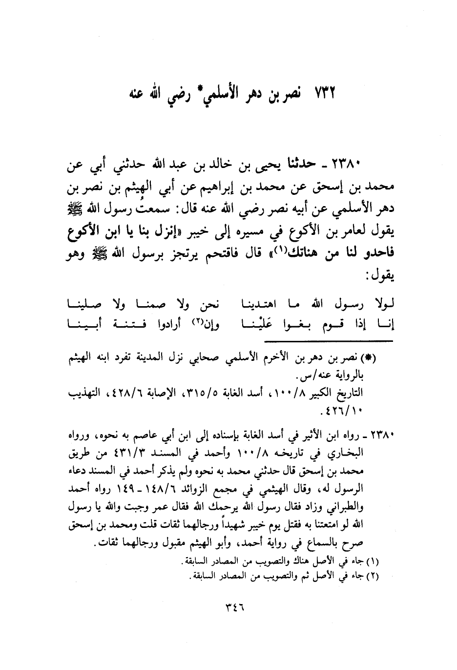 2380 - حَدَّثَنَا، يَحْيَى بْنُ خَالِدِ بْنِ عَبْدِ اللَّهِ، حَدَّثَنِي، أَبِي، عَنْ، مُحَمَّدِ بْنِ إِسْحَاقَ، عَنْ، مُحَمَّدِ بْنِ إِبْرَاهِيمَ، عَنْ، أَبِي الْهَيْثَمِ بْنِ نَصْرِ بْنِ دَهْرٍ الْأَسْلَمِيِّ، عَنْ أَبِيهِ نَصْرٍ رَضِيَ اللَّهُ عَنْهُ قَالَ: سَمِعْتُ رَسُولَ اللَّهِ صَلَّى اللهُ عَلَيْهِ وَسَلَّمَ يَقُولُ لِعَامِرِ بْنِ الْأَكْوَعِ فِي مَسِيرِهِ إِلَى خَيْبَرَ: «§انْزِلْ بِنَا يَا ابْنَ الْأَكْوَعِ فَاحْدُ لَنَا مِنْ هَنَاتِكَ» قَالَ: فَاقْتَحَمَ يَرْتَجِزُ بِرَسُولِ اللَّهِ صَلَّى اللهُ عَلَيْهِ وَسَلَّمَ وَهُوَ يَقُولُ: