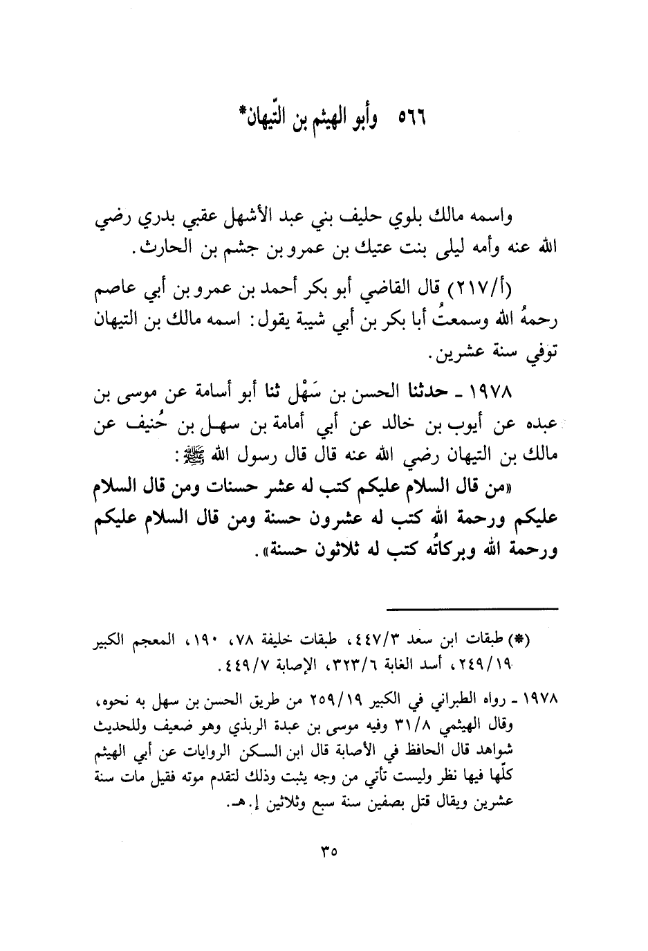 1978 - حَدَّثَنَا الْحَسَنُ بْنُ سَهْلٍ، ثنا أَبُو أُسَامَةَ، عَنْ مُوسَى بْنِ عَبْدِهِ، عَنْ أَيُّوبَ بْنِ خَالِدٍ، عَنْ أَبِي أُمَامَةَ بْنِ سَهْلِ بْنِ حُنَيْفٍ، عَنْ مَالِكِ بْنِ التَّيْهَانِ، رَضِيَ اللَّهُ عَنْهُ قَالَ: قَالَ رَسُولُ اللَّهِ صَلَّى اللهُ عَلَيْهِ وَسَلَّمَ: «§مَنْ قَالَ السَّلَامُ عَلَيْكُمْ كُتِبَ لَهُ عَشْرُ حَسَنَاتٍ، وَمَنْ قَالَ السَّلَامُ عَلَيْكُمْ وَرَحْمَةُ اللَّهِ كُتِبَ لَهُ عِشْرُونَ حَسَنَةً، وَمَنْ قَالَ السَّلَامُ عَلَيْكُمْ وَرَحْمَةُ اللَّهِ وَبَرَكَاتُهُ كُتِبَ لَهُ ثَلَاثُونَ حَسَنَةً»