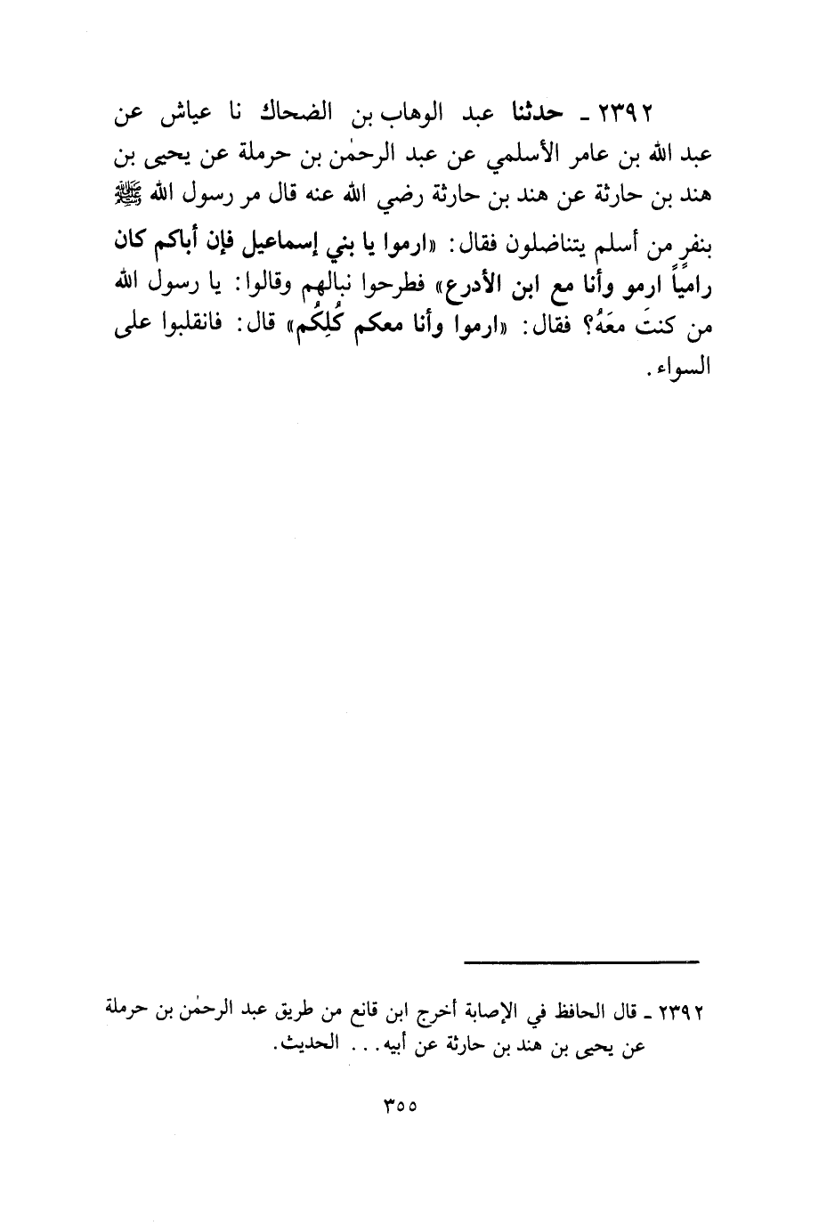 2392 - حَدَّثَنَا عَبْدُ الْوَهَّابِ بْنُ الضَّحَّاكِ، نا ابْنُ عَيَّاشٌ، عَنْ عَبْدِ اللَّهِ بْنِ عَامِرٍ الْأَسْلَمِيِّ، عَنْ عَبْدِ الرَّحْمَنِ بْنِ حَرْمَلَةَ، عَنْ يَحْيَى بْنِ هِنْدَ بْنِ حَارِثَةَ، عَنْ هِنْدَ بْنِ حَارِثَةَ، رَضِيَ اللَّهُ عَنْهُ قَالَ: مَرَّ رَسُولُ اللَّهِ صَلَّى اللهُ عَلَيْهِ وَسَلَّمَ بِنَفَرٍ مِنْ أَسْلَمَ يَتَنَاضَلُونَ فَقَالَ: «§ارْمُوا يَا بَنِي إِسْمَاعِيلَ فَإِنَّ أَبَاكُمْ كَانَ رَامِيًا ارْمُوا وَأَنَا مَعَ ابْنِ الْأَدْرَعِ» فَطَرَحُوا نِبَالَهُمْ وَقَالُوا: يَا رَسُولَ اللَّهِ مَنْ كُنْتَ مَعَهُ فَقَالَ: «ارْمُوا وَأَنَا مَعَكُمْ كُلُّكُمْ» قَالَ: فَانْقَلَبُوا عَلَى السَّوَاءِ
