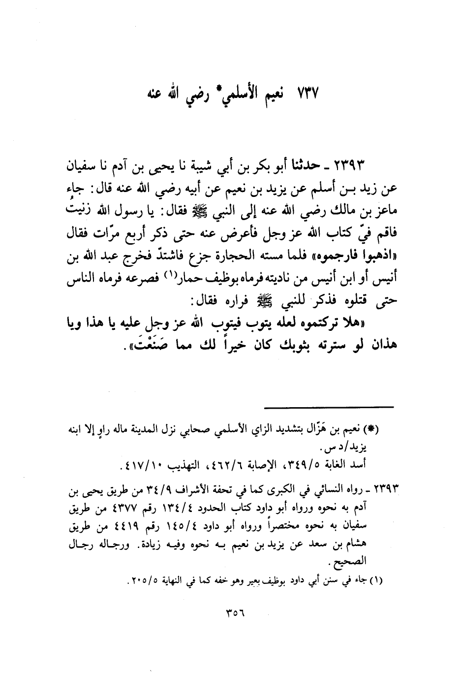 2393 - حَدَّثَنَا أَبُو بَكْرِ بْنُ أَبِي شَيْبَةَ، نا يَحْيَى بْنُ آدَمَ، نا سُفْيَانُ، عَنْ زَيْدِ بْنِ أَسْلَمَ، عَنْ يَزِيدَ بْنِ نُعَيْمٍ، عَنْ أَبِيهِ، رَضِيَ اللَّهُ عَنْهُ قَالَ: " جَاءَ مَاعِزُ بْنُ مَالِكٍ رَضِيَ اللَّهُ عَنْهُ إِلَى النَّبِيِّ صَلَّى اللهُ عَلَيْهِ وَسَلَّمَ فَقَالَ: يَا رَسُولَ اللَّهِ، زَنَيْتُ، فَأَقِمْ فِيَّ كِتَابَ اللَّهِ عَزَّ وَجَلَّ، فَأَعْرَضَ عَنْهُ حَتَّى ذَكَرَ أَرْبَعَ مَرَّاتٍ فَقَالَ: «§اذْهَبُوا فَارْجُمُوهُ» فَلَمَّا مَسَّتْهُ الْحِجَارَةُ جَزِعَ فَاشْتَدَّ فَخَرَجَ عَبْدُ اللَّهِ بْنُ أُنَيْسٍ أَوِ ابْنُ أُنَيْسٍ مِنْ نَادِيَتِهِ فَرَمَاهُ بِوَظِيفِ حِمَارٍ فَصَرَعَهُ فَرَمَاهُ النَّاسُ حَتَّى قَتَلُوهُ، فَذُكِرَ لِلنَّبِيِّ صَلَّى اللهُ عَلَيْهِ وَسَلَّمَ فِرَارُهُ فَقَالَ: «هَلَّا تَرَكْتُمُوهُ لَعَلَّهُ يَتُوبُ فَيَتُوبَ اللَّهُ عَزَّ وَجَلَّ عَلَيْهِ، يَا هَذَا وَيَا هَذَانِ لَوْ سَتَرْتَهُ بِثَوْبِكَ كَانَ خَيْرًا لَكَ مِمَّا صَنَعْتَ»
