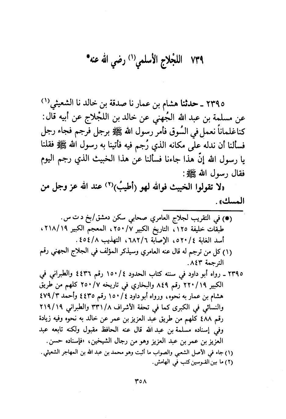 2395 - حَدَّثَنَا هِشَامُ بْنُ عَمَّارٍ، نا صَدَقَةُ بْنُ خَالِدٍ، نا الشُّعَيْثِيُّ، عَنْ مَسْلَمَةَ بْنِ عَبْدِ اللَّهِ الْجُهَنِيِّ، عَنْ خَالِدِ بْنِ اللَّجْلَاجِ، عَنْ أَبِيهِ، قَالَ: " كُنَّا غِلْمَانًا نَعْمَلُ فِي السُّوقِ فَأَمَرَ رَسُولُ اللَّهِ صَلَّى اللهُ عَلَيْهِ وَسَلَّمَ بِرَجُلٍ فَرُجِمَ فَجَاءَ رَجُلٌ فَسَأَلَنَا أَنْ نَدُلَّهُ عَلَى مَكَانِهِ الَّذِي رُجِمَ فِيهِ فَأَتَيْنَا بِهِ رَسُولَ اللَّهِ صَلَّى اللهُ عَلَيْهِ وَسَلَّمَ فَقُلْنَا: يَا رَسُولَ اللَّهِ إِنَّ هَذَا جَاءَنَا فَسَأَلَنَا عَنْ هَذَا الْخَبِيثِ الَّذِي رُجِمَ الْيَوْمَ فَقَالَ رَسُولُ اللَّهِ صَلَّى اللهُ عَلَيْهِ وَسَلَّمَ: «§لَا تَقُولُوا الْخَبِيثَ فَوَاللَّهِ لَهُوَ أَطْيَبُ عِنْدَ اللَّهِ عَزَّ وَجَلَّ مِنَ الْمِسْكِ»