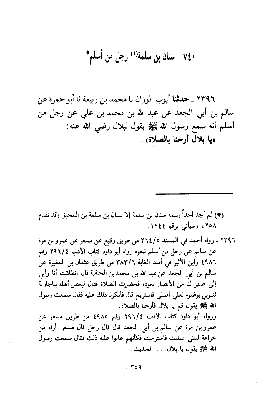 2396 - حَدَّثَنَا، أَيُّوبُ الْوَزَّانُ، نا، مُحَمَّدُ بْنُ رَبِيعَةَ، نا، أَبُو حَمْزَةَ، عَنْ، سَالِمِ بْنِ أَبِي الْجَعْدِ، عَنْ، عَبْدِ اللَّهِ بْنِ مُحَمَّدِ بْنِ عَلِيٍّ، عَنْ، رَجُلٍ مِنْ أَسْلَمَ أَنَّهُ سَمِعَ رَسُولَ اللَّهِ صَلَّى اللهُ عَلَيْهِ وَسَلَّمَ يَقُولُ لِبِلَالٍ رَضِيَ اللَّهُ عَنْهُ: «يَا بِلَالُ §أَرِحْنَا بِالصَّلَاةِ»