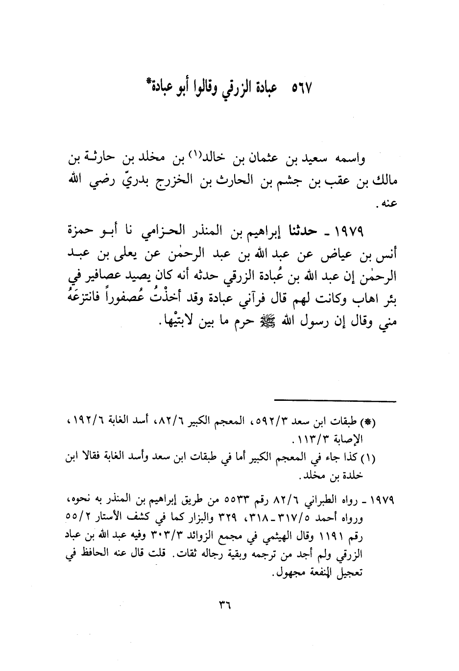 1979 - حَدَّثَنَا إِبْرَاهِيمُ بْنُ الْمُنْذِرِ الْحِزَامِيُّ، نا أَبُو حَمْزَةَ، أَنَسُ بْنُ عِيَاضٍ، عَنْ عَبْدِ اللَّهِ بْنِ عَبْدِ الرَّحْمَنِ، عَنْ يَعْلَى بْنِ عَبْدِ الرَّحْمَنِ، إِنَّ عَبْدَ اللَّهِ بْنَ عُبَادَةَ الزُّرَقِيَّ حَدَّثَهُ " أَنَّهُ كَانَ يَصِيدُ عَصَافِيرَ فِي بِئْرِ أَهَابٍ وَكَانَتْ لَهُمْ قَالَ: فَرَآنِي عُبَادَةُ وَقَدْ أَخَذْتُ عُصْفُورًا فَانْتَزَعَهُ مِنِّي وَقَالَ: إِنَّ §رَسُولَ اللَّهِ صَلَّى اللهُ عَلَيْهِ وَسَلَّمَ حَرَّمَ مَا بَيْنَ لَابَتَيْهَا "