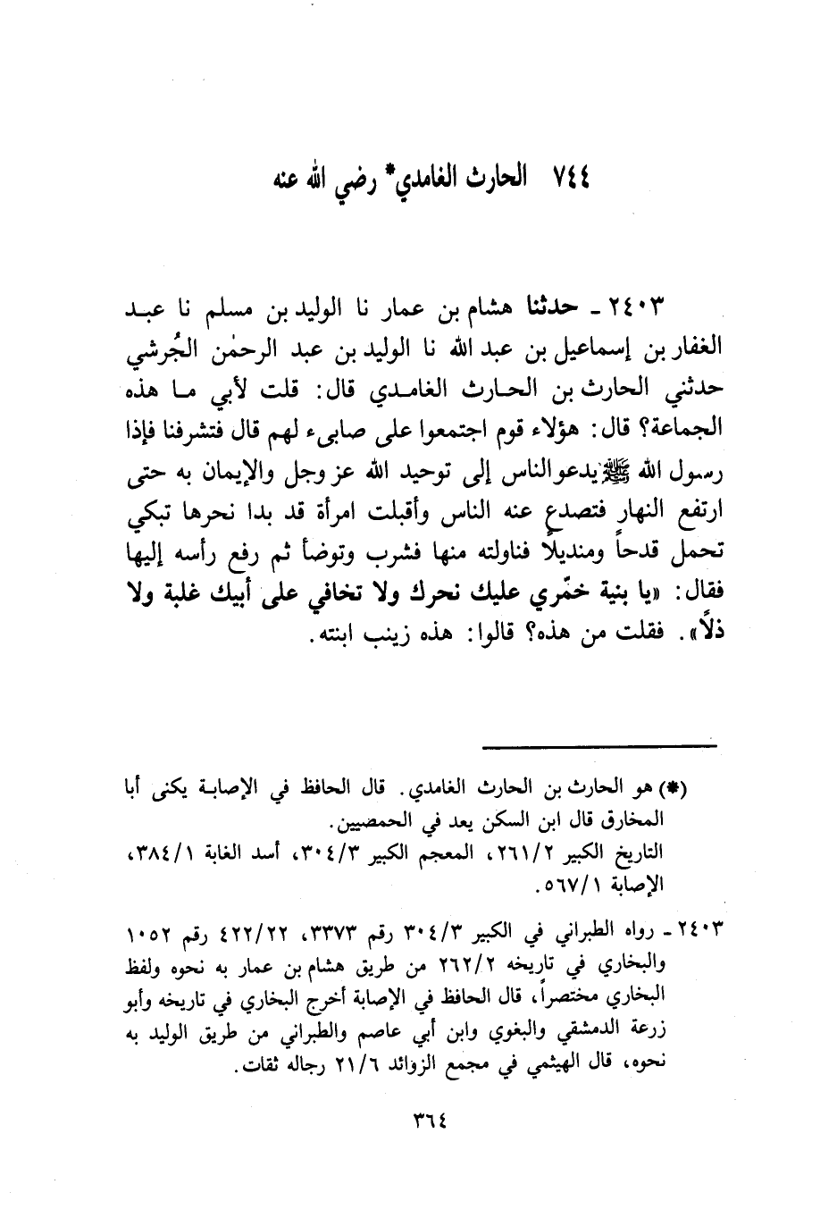 2403 - حَدَّثَنَا، هِشَامُ بْنُ عَمَّارٍ، نا الْوَلِيدُ بْنُ مُسْلِمٍ، نا، عَبْدُ الْغَفَّارِ بْنُ إِسْمَاعِيلَ بْنِ عَبْدِ اللَّهِ، نا، الْوَلِيدُ بْنُ عَبْدِ الرَّحْمَنِ الْجُرَشِيُّ، حَدَّثَنِي الْحَارِثُ بْنُ الْحَارِثِ الْغَامِدِيُّ، قَالَ: قُلْتُ لِأَبِي: مَا هَذِهِ الْجَمَاعَةُ؟ قَالَ: هَؤُلَاءِ قَوْمٌ اجْتَمَعُوا عَلَى صَابِئٍ لَهُمْ قَالَ: فَتَشَرَّفْنَا فَإِذَا رَسُولُ اللَّهِ صَلَّى اللهُ عَلَيْهِ وَسَلَّمَ يَدْعُو النَّاسَ إِلَى تَوْحِيدِ اللَّهِ عَزَّ وَجَلَّ وَالْإِيمَانِ بِهِ حَتَّى ارْتَفَعَ النَّهَارُ فَتَصَدَّعَ عَنْهُ النَّاسُ، وَأَقْبَلَتِ امْرَأَةٌ قَدْ بَدَا نَحْرُهَا تَبْكِي تَحْمِلُ قَدَحًا وَمِنْدِيلًا فَنَاوَلَتْهُ مِنْهَا فَشَرِبَ وَتَوَضَّأَ ثُمَّ رَفَعَ رَأْسَهُ إِلَيْهَا فَقَالَ: «§يَا بُنَيَّةُ خَمِّرِي عَلَيْكِ نَحْرَكِ وَلَا تَخَافِي عَلَى أَبِيكِ غَلَبَةً وَلَا ذُلًّا» فَقُلْتُ: مَنْ هَذِهِ؟ قَالُوا: هَذِهِ زَيْنَبُ ابْنَتُهُ "