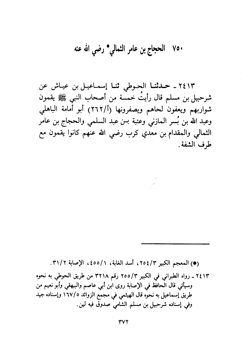 2413 - حَدَّثَنَا الْحَوْطِيُّ، ثنا إِسْمَاعِيلُ بْنُ عَيَّاشٍ، عَنْ شُرَحْبِيلِ بْنِ مُسْلِمٍ، قَالَ: «§رَأَيْتُ خَمْسَةً مِنْ أَصْحَابِ النَّبِيِّ صَلَّى اللهُ عَلَيْهِ وَسَلَّمَ يُقْمُونَ شَوَارِبَهُمْ وَيُعْفُونَ لِحَاهُمْ وَيُصَفِّرُونَها. أَبُو أُمَامَةَ الْبَاهِلِيُّ وَعَبْدُ اللَّهِ بْنُ بُسْرٍ الْمَازِنِيُّ، وَعُتْبَةُ بْنُ عَبْدٍ السَّلَمِيُّ، وَالْحَجَّاجُ بْنُ عَامِرٍ الثُّمَالِيُّ، وَالْمِقْدَامُ بْنُ مَعْدِي كَرِبَ رَضِيَ اللَّهُ عَنْهُمْ كَانُوا يُقْمُونَ مَعَ طَرَفِ الشَّفَةِ»