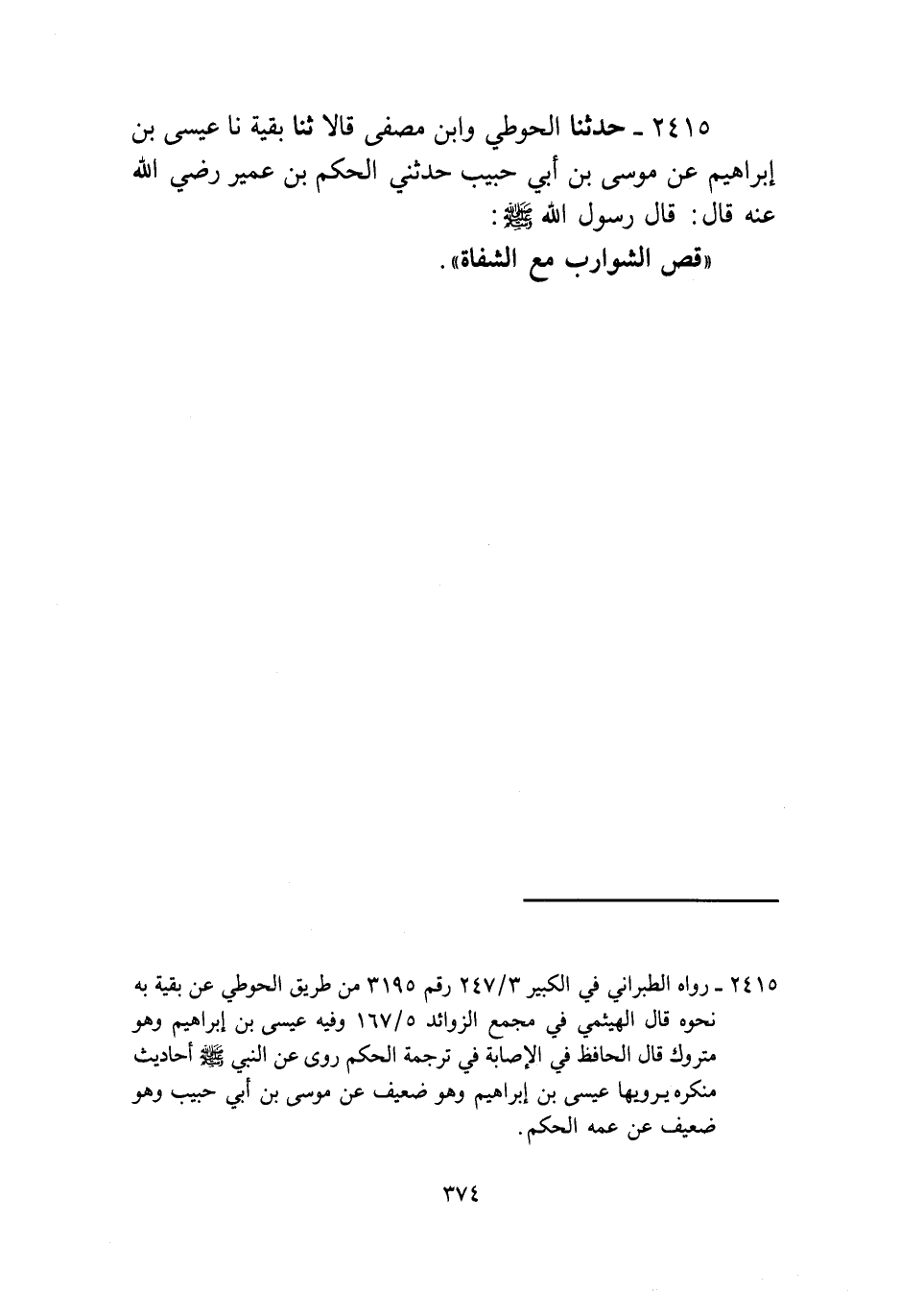 2415 - حَدَّثَنَا، الْحَوْطِيُّ، وَابْنُ مُصَفَّى قَالَا: ثنا، بَقِيَّةُ، نا، عِيسَى بْنُ إِبْرَاهِيمَ، عَنْ، مُوسَى بْنِ أَبِي حَبِيبٍ، حَدَّثَنِي، الْحَكَمُ بْنُ عُمَيْرٍ، رَضِيَ اللَّهُ عَنْهُ قَالَ: قَالَ رَسُولُ اللَّهِ صَلَّى اللهُ عَلَيْهِ وَسَلَّمَ: «§قَصُّ الشَّوَارِبِ مَعَ الشِّفَاهِ»