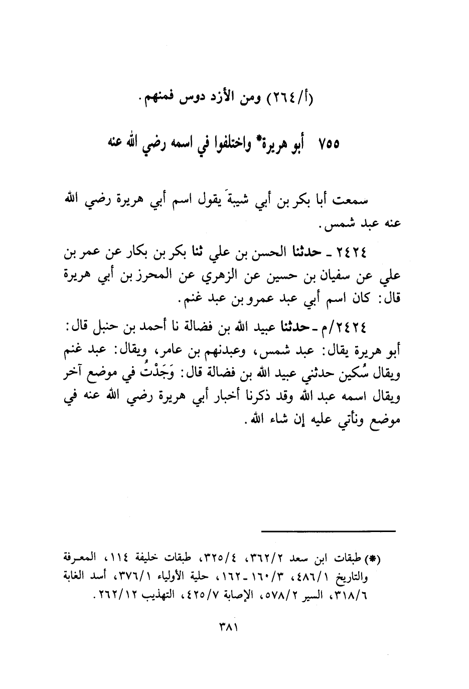 2424 - حَدَّثَنَا الْحَسَنُ بْنُ عَلِيٍّ، ثنا بَكْرُ بْنُ بَكَّارٍ، عَنْ عُمَرَ بْنِ عَلِيٍّ، عَنْ سُفْيَانَ بْنِ حُسَيْنٍ، عَنِ الزُّهْرِيِّ، عَنِ المُحَرَّرِ بْنِ أَبِي هُرَيْرَةَ، قَالَ: «§كَانَ اسْمُ أَبِي عَبْدَ عَمْرِو بْنَ عَبْدِ غَنَمٍ» حَدَّثَنَا عُبَيْدُ اللَّهِ بْنُ فَضَالَةَ نا أَحْمَدُ بْنُ حَنْبَلٍ، قَالَ: أَبُو هُرَيْرَةَ يُقَالُ: عَبْدُ شَمْسٍ وَعَبْدُ نَهَمِ بْنُ عَامِرٍ وَيُقَالُ: عَبْدُ غَنَمٍ وَيُقَالُ: سِكِّينٌ، حَدَّثَنِي عُبَيْدُ اللَّهِ بْنُ فَضَالَةَ، قَالَ: وَجَدْتُ فِي مَوْضِعٍ آخَرَ وَيُقَالُ: اسْمُهُ عَبْدُ اللَّهِ، وَقَدْ ذَكَرْنَا أَخْبَارَ أَبِي هُرَيْرَةَ رَضِيَ اللَّهُ عَنْهُ فِي مَوْضِعٍ، وَنَأْتِي عَلَيْهِ إِنْ شَاءَ اللَّهُ