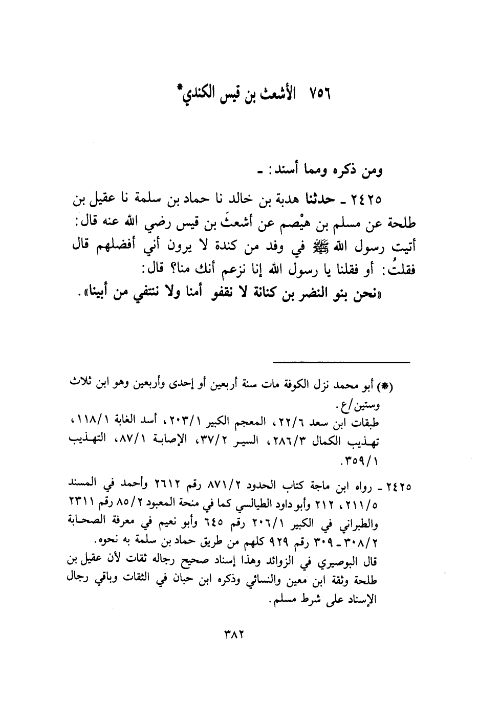 2425 - حَدَّثَنَا هُدْبَةُ بْنُ خَالِدٍ، نا حَمَّادُ بْنُ سَلَمَةَ، نا عَقِيلُ بْنُ طَلْحَةَ، عَنْ مُسْلِمِ بْنِ هَيْصَمٍ، عَنْ أَشْعَثَ بْنِ قَيْسٍ، رَضِيَ اللَّهُ عَنْهُ قَالَ: أَتَيْتُ رَسُولَ اللَّهِ صَلَّى اللهُ عَلَيْهِ وَسَلَّمَ فِي وَفْدٍ مِنْ كِنْدَةَ لَا يَرَوْنَ أَنِّي أَفْضَلُهُمْ قَالَ: فَقُلْتُ أَوْ فَقُلْنَا: يَا رَسُولَ اللَّهِ إِنَّا نَزْعُمُ أَنَّكَ مِنَّا قَالَ: «§نَحْنُ بَنُو النَّضْرِ بْنُ كِنَانَةَ لَا نَقْفُو أُمَّنَا وَلَا نَنْتَفِي مِنْ أَبِينَا»