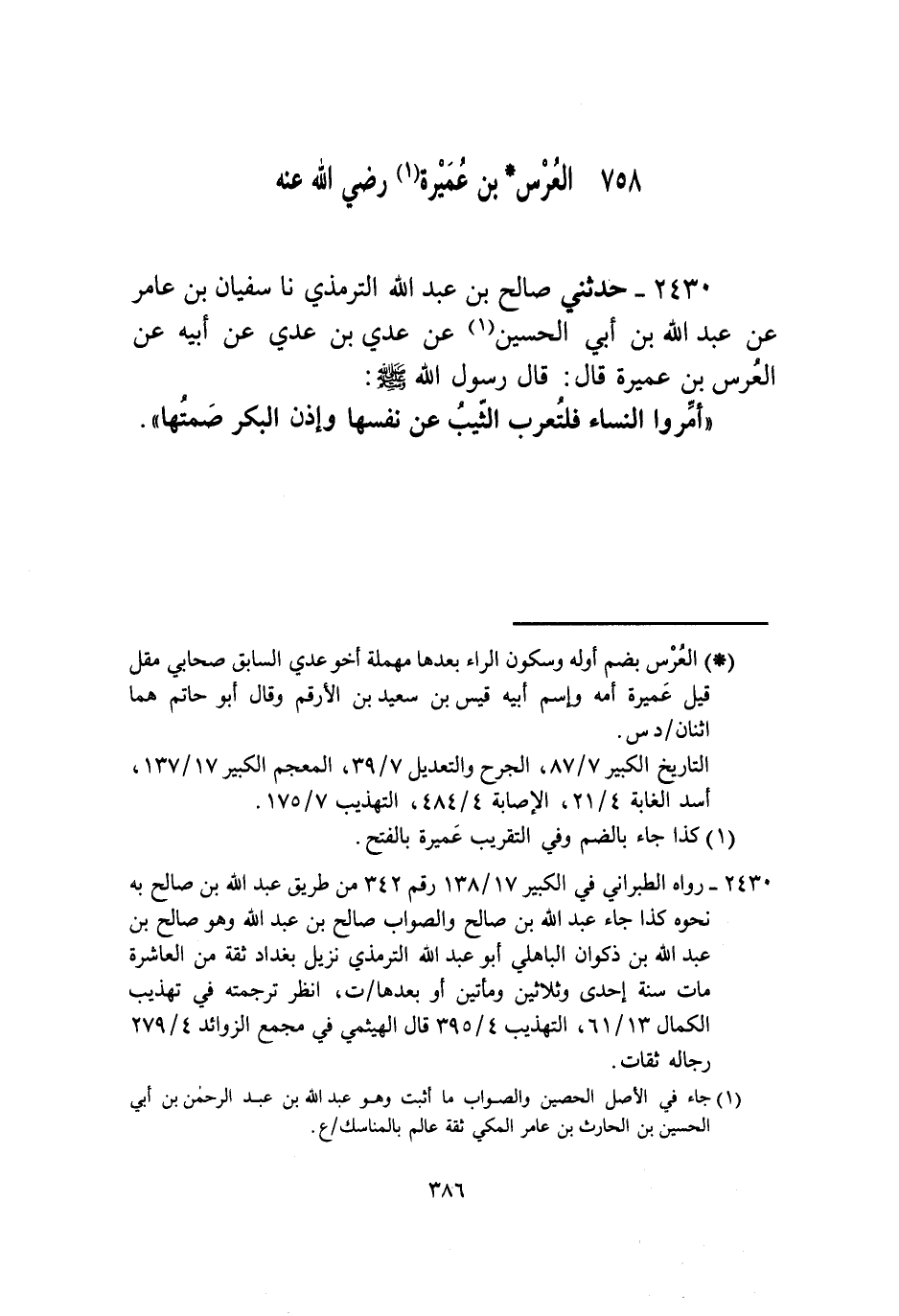 2430 - حَدَّثَنِي صَالِحُ بْنُ عَبْدِ اللَّهِ التِّرْمِذِيُّ، نا سُفْيَانُ بْنُ عَامِرٍ، عَنْ عَبْدِ اللَّهِ بْنِ أَبِي الْحُسَيْنِ، عَنْ عَدِيِّ بْنِ عَدِيٍّ، عَنْ أَبِيهِ، عَنِ الْعُرْسِ بْنِ عَمِيرَةَ، قَالَ: قَالَ رَسُولُ اللَّهِ صَلَّى اللهُ عَلَيْهِ وَسَلَّمَ: «§أَمِّرُوا النِّسَاءَ فَلْتُعْرِبُ الثَّيِّبُ عَنْ نَفْسِهَا، وَإِذْنُ الْبِكْرِ صَمْتُهَا»