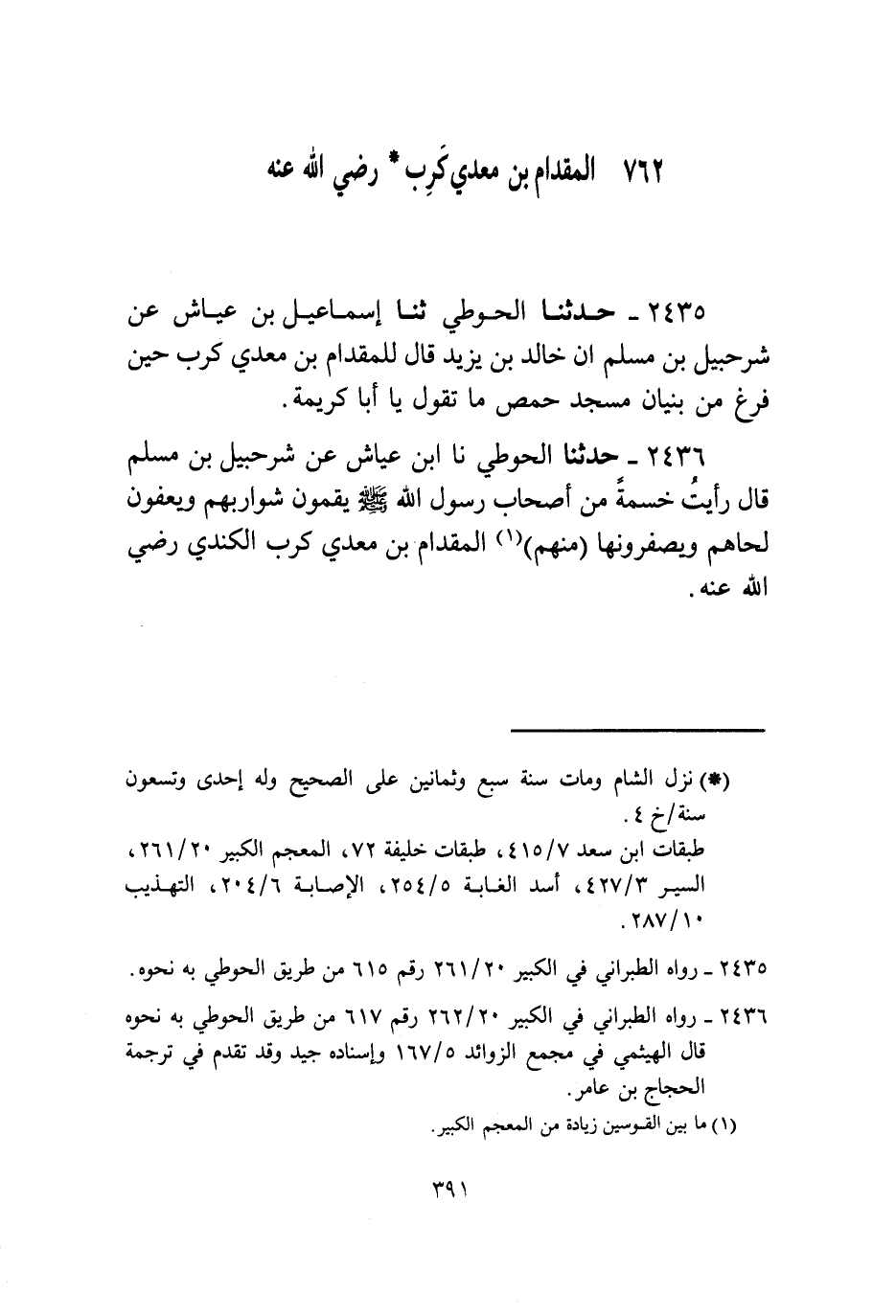 2435 - حَدَّثَنَا الْحَوْطِيُّ، ثنا إِسْمَاعِيلُ بْنُ عَيَّاشٍ، عَنْ شُرَحْبِيلَ بْنِ مُسْلِمٍ، أَنَّ خَالِدَ بْنَ يَزِيدَ، قَالَ لِلْمِقْدَامِ بْنِ مَعْدِي كَرِبَ حِينَ فَرَغَ مِنْ بُنْيَانِ مَسْجِدِ حِمْصَ: «§مَا تَقُولُ يَا أَبَا كَرِيمَةَ»