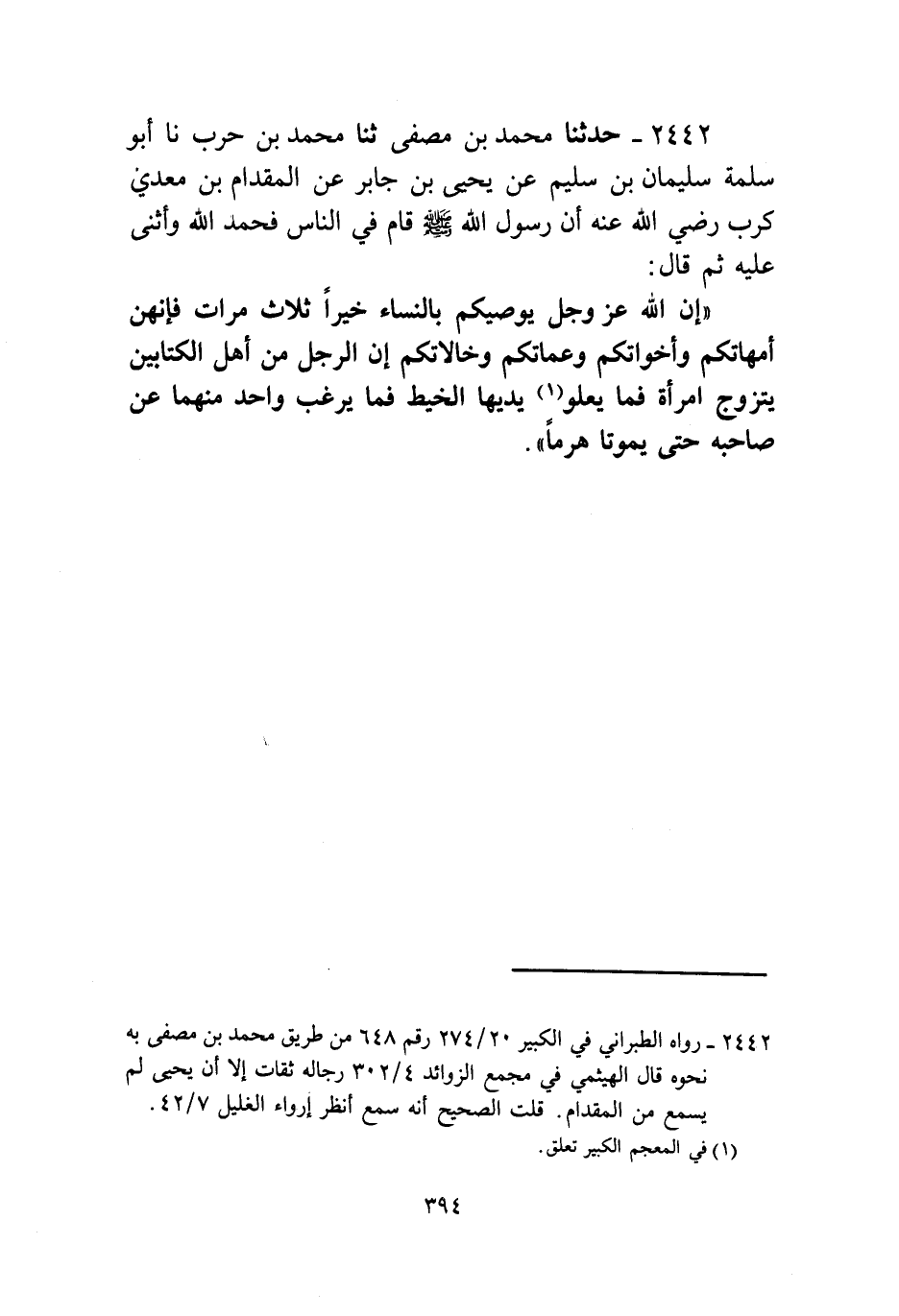 2442 - حَدَّثَنَا مُحَمَّدُ بْنُ مُصَفَّى، ثنا مُحَمَّدُ بْنُ حَرْبٍ، نا أَبُو سَلَمَةَ، سُلَيْمَانُ بْنُ سُلَيْمٍ عَنْ يَحْيَى بْنِ جَابِرٍ، عَنِ الْمِقْدَامِ بْنِ مَعْدِي كَرِبَ رَضِيَ اللَّهُ عَنْهُ أَنَّ رَسُولَ اللَّهِ صَلَّى اللهُ عَلَيْهِ وَسَلَّمَ قَامَ فِي النَّاسِ فَحَمِدَ اللَّهَ وَأَثْنَى عَلَيْهِ، ثُمَّ قَالَ: «إِنَّ اللَّهَ عَزَّ وَجَلَّ §يُوصِيكُمْ بِالنِّسَاءِ خَيْرًا» ثَلَاثَ مَرَّاتٍ «فَإِنَّهُنَّ أُمَّهَاتُكُمْ وَأَخَوَاتُكُمْ وَعَمَّاتُكُمْ وَخَالَاتُكُمْ إِنَّ الرَّجُلَ مِنْ أَهْلِ الْكِتَابَيْنِ يَتَزَوَّجُ امْرَأَةً فَمَا يَعْلُو يَدَيْهَا الْخَيْطُ فَمَا يَرْغَبُ وَاحِدٌ مِنْهُمَا عَنْ صَاحِبِهِ حَتَّى يَمُوتَا هَرَمًا»