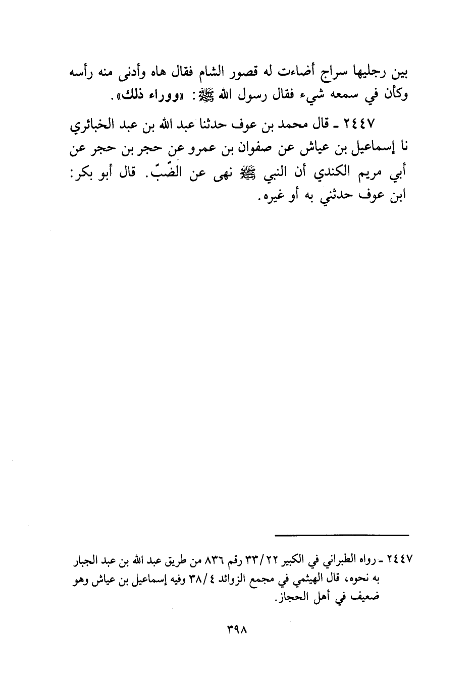 2447 - قَالَ مُحَمَّدُ بْنُ عَوْفٍ: حَدَّثَنَا عَبْدُ اللَّهِ بْنُ عَبْدٍ الْخَبَائِرِيُّ، نا إِسْمَاعِيلُ بْنُ عَيَّاشٍ، عَنْ صَفْوَانَ بْنِ عَمْرٍو، عَنْ حَجَرِ بْنِ حَجَرٍ، عَنْ أَبِي مَرْيَمَ الْكِنْدِيِّ، " أَنَّ النَّبِيَّ صَلَّى اللهُ عَلَيْهِ وَسَلَّمَ §نَهَى عَنِ الضَّبِّ قَالَ أَبُو بَكْرٍ: ابْنُ عَوْفٍ حَدَّثَنِي بِهِ أَوْ غَيْرُهُ
