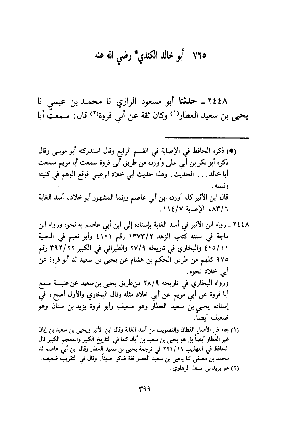 2448 - حَدَّثَنَا أَبُو مَسْعُودٍ الرَّازِيُّ، نا مُحَمَّدُ بْنُ عِيسَى، نا يَحْيَى بْنُ سَعِيدٍ الْعَطَّارُ، وَكَانَ ثِقَةً عَنْ أَبِي فَرْوَةَ، قَالَ: سَمِعْتُ أَبَا -[400]- مَرْيَمَ، يَقُولُ: سَمِعْتُ أَبَا خَالِدٍ الْكِنْدِيَّ، رَضِيَ اللَّهُ عَنْهُ يَقُولُ: سَمِعْتُ رَسُولَ اللَّهِ صَلَّى اللهُ عَلَيْهِ وَسَلَّمَ يَقُولُ: «§إِذَا رَأَيْتُمُ الرَّجُلَ قَدْ أُعْطِيَ زَهَادَةً فِي الدُّنْيَا وَقِلَّةَ مَنْطِقٍ فَاقْتَرِبُوا مِنْهُ فَإِنَّمَا يُلْقِي الْحِكْمَةَ»