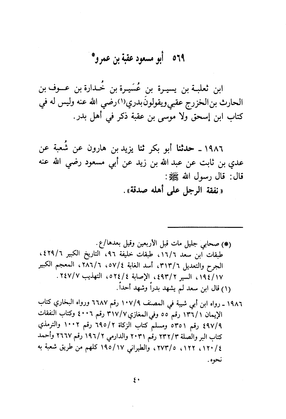 1986 - حَدَّثَنَا أَبُو بَكْرٍ، ثنا يَزِيدُ بْنُ هَارُونَ، عَنْ شُعْبَةَ، عَنْ عَدِيِّ بْنِ ثَابِتٍ، عَنْ عَبْدِ اللَّهِ بْنِ يَزِيدَ، عَنْ أَبِي مَسْعُودٍ، رَضِيَ اللَّهُ عَنْهُ قَالَ: قَالَ رَسُولُ اللَّهِ صَلَّى اللهُ عَلَيْهِ وَسَلَّمَ: «§نَفَقَةُ الرَّجُلِ عَلَى أَهْلِهِ صَدَقَةٌ»