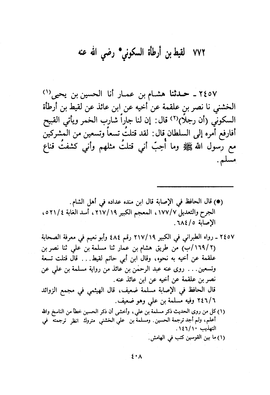 2457 - حَدَّثَنَا هِشَامُ بْنُ عَمَّارٍ، أنا الْحُسَيْنُ بْنُ يَحْيَى الْخُشَنِيُّ، نا نَصْرُ بْنُ عَلْقَمَةَ، عَنْ أَخِيهِ، عَنِ ابْنِ عَائِذٍ، عَنْ لَقِيطِ بْنِ أَرْطَأَةَ السَّكُونِيِّ، أَنَّ رَجُلًا، قَالَ: " إِنَّ §لَنَا جَارًا شَارِبَ الْخَمْرِ وَيَأْتِي الْقَبِيحَ، أَفَأَرْفَعُ أَمْرَهُ إِلَى السُّلْطَانِ؟ قَالَ: لَقَدْ قَتَلْتُ تِسْعًا وَتِسْعِينَ مِنَ الْمُشْرِكِينَ مَعَ رَسُولِ اللَّهِ صَلَّى اللهُ عَلَيْهِ وَسَلَّمَ، وَمَا أُحِبُّ أَنِّي قَتَلْتُ مِثْلَهُمْ وَأَنِّي كَشَفْتُ قِنَاعَ مُسْلِمٍ "