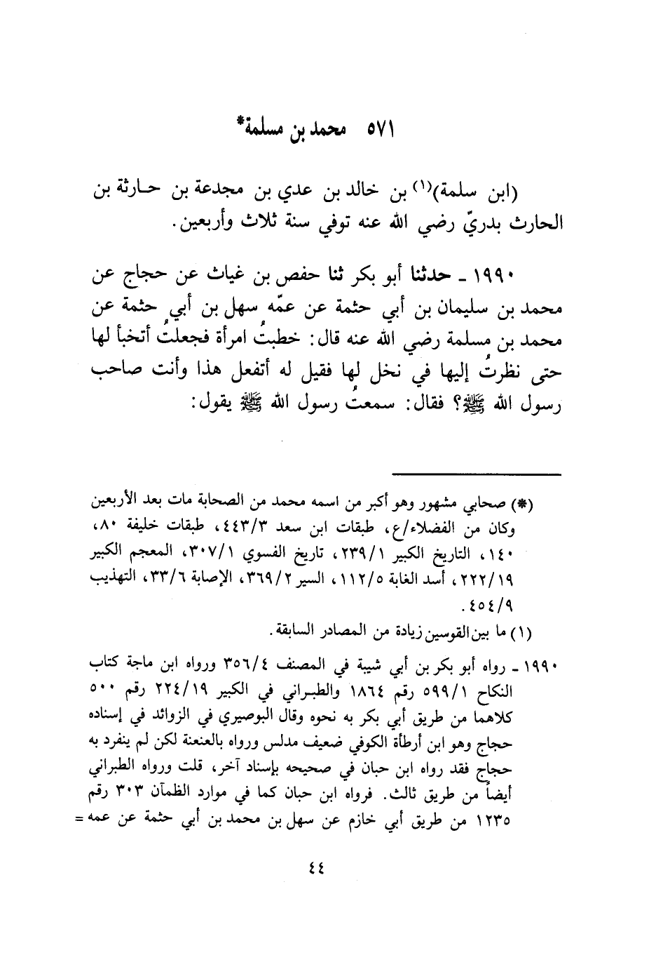 1990 - حَدَّثَنَا أَبُو بَكْرٍ، ثنا حَفْصُ بْنُ غِيَاثٍ، عَنْ حَجَّاجٍ، عَنْ مُحَمَّدِ بْنِ سُلَيْمَانَ بْنِ أَبِي حَثْمَةَ، عَنْ عَمِّهِ سَهْلِ بْنِ أَبِي حَثْمَةَ عَنْ مُحَمَّدِ بْنِ مَسْلَمَةَ، رَضِيَ اللَّهُ عَنْهُ قَالَ: خَطَبْتُ امْرَأَةً فَجَعَلْتُ أَتَخَبَّأُ لَهَا حَتَّى نَظَرْتُ إِلَيْهَا فِي نَخْلٍ لَهَا فَقِيلَ لَهُ أَتَفْعَلُ هَذَا وَأَنْتَ صَاحِبُ رَسُولِ اللَّهِ صَلَّى اللهُ عَلَيْهِ وَسَلَّمَ فَقَالَ: سَمِعْتُ رَسُولَ اللَّهِ صَلَّى اللهُ عَلَيْهِ وَسَلَّمَ يَقُولُ: «§إِذَا أَلْقَى اللَّهُ عَزَّ وَجَلَّ فِي قَلْبِ امْرِئٍ مِنْكُمْ خِطْبَةَ امْرَأَةٍ فَلَا بَأْسَ أَنْ يَنْظُرَ إِلَيْهَا»