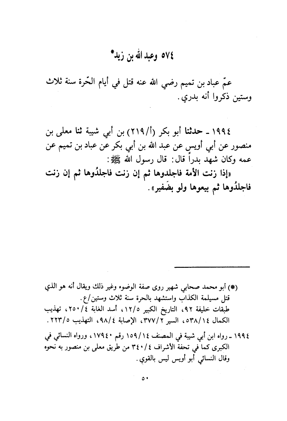 1994 - حَدَّثَنَا أَبُو بَكْرِ بْنُ أَبِي شَيْبَةَ، ثنا مُعَلَّى بْنُ مَنْصُورٍ، عَنْ أَبِي أُوَيْسٍ، عَنْ عَبْدِ اللَّهِ بْنِ أَبِي بَكْرٍ، عَنْ عَبَّادِ بْنِ تَمِيمٍ، عَنْ عَمِّهِ وَكَانَ شَهِدَ بَدْرًا قَالَ: قَالَ رَسُولُ اللَّهِ صَلَّى اللهُ عَلَيْهِ وَسَلَّمَ: «§إِذَا زَنَتِ الْأَمَةُ فَاجْلِدُوهَا، ثُمَّ إِنْ زَنَتْ فَاجْلِدُوهَا، ثُمَّ إِنْ زَنَتْ فَاجْلِدُوهَا، ثُمَّ بِيعُوهَا وَلَوْ بِضَفِيرٍ»