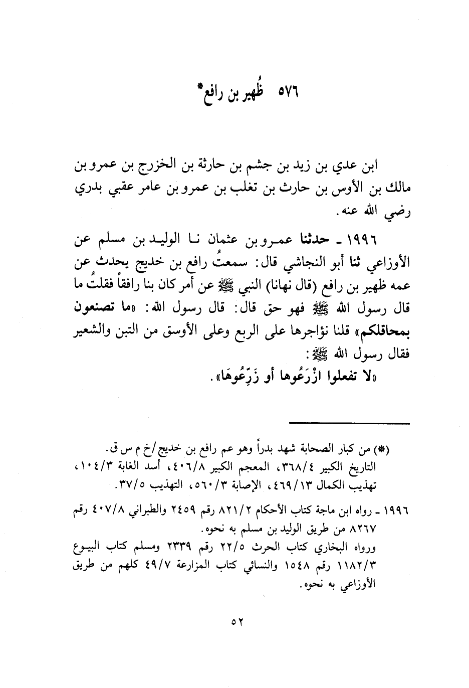 1996 - حَدَّثَنَا عَمْرُو بْنُ عُثْمَانَ، نا الْوَلِيدُ بْنُ مُسْلِمٍ، عَنِ الْأَوْزَاعِيِّ، ثنا أَبُو النَّجَاشِيِّ، قَالَ: سَمِعْتُ رَافِعَ بْنَ خَدِيجٍ، يُحَدِّثُ عَنْ عَمِّهِ ظُهَيْرِ بْنِ رَافِعٍ قَالَ: " §نَهَانَا النَّبِيُّ صَلَّى اللهُ عَلَيْهِ وَسَلَّمَ عَنْ أَمْرٍ كَانَ بِنَا رَافِقًا. فَقُلْتُ: مَا قَالَ رَسُولُ اللَّهِ صَلَّى اللهُ عَلَيْهِ وَسَلَّمَ فَهُوَ حَقٌّ. قَالَ: قَالَ رَسُولُ اللَّهِ: «مَا تَصْنَعُونَ بِمَحَاقِلِكُمْ؟» قُلْنَا: نُؤَاجِرُهَا عَلَى الرُّبُعِ وَعَلَى الْأَوْسُقِ مِنَ التِّبْنِ وَالشَّعِيرِ، فَقَالَ رَسُولُ اللَّهِ صَلَّى اللهُ عَلَيْهِ وَسَلَّمَ: «لَا تَفْعَلُوا، ازْرَعُوهَا أَوْ زَرِّعُوها»