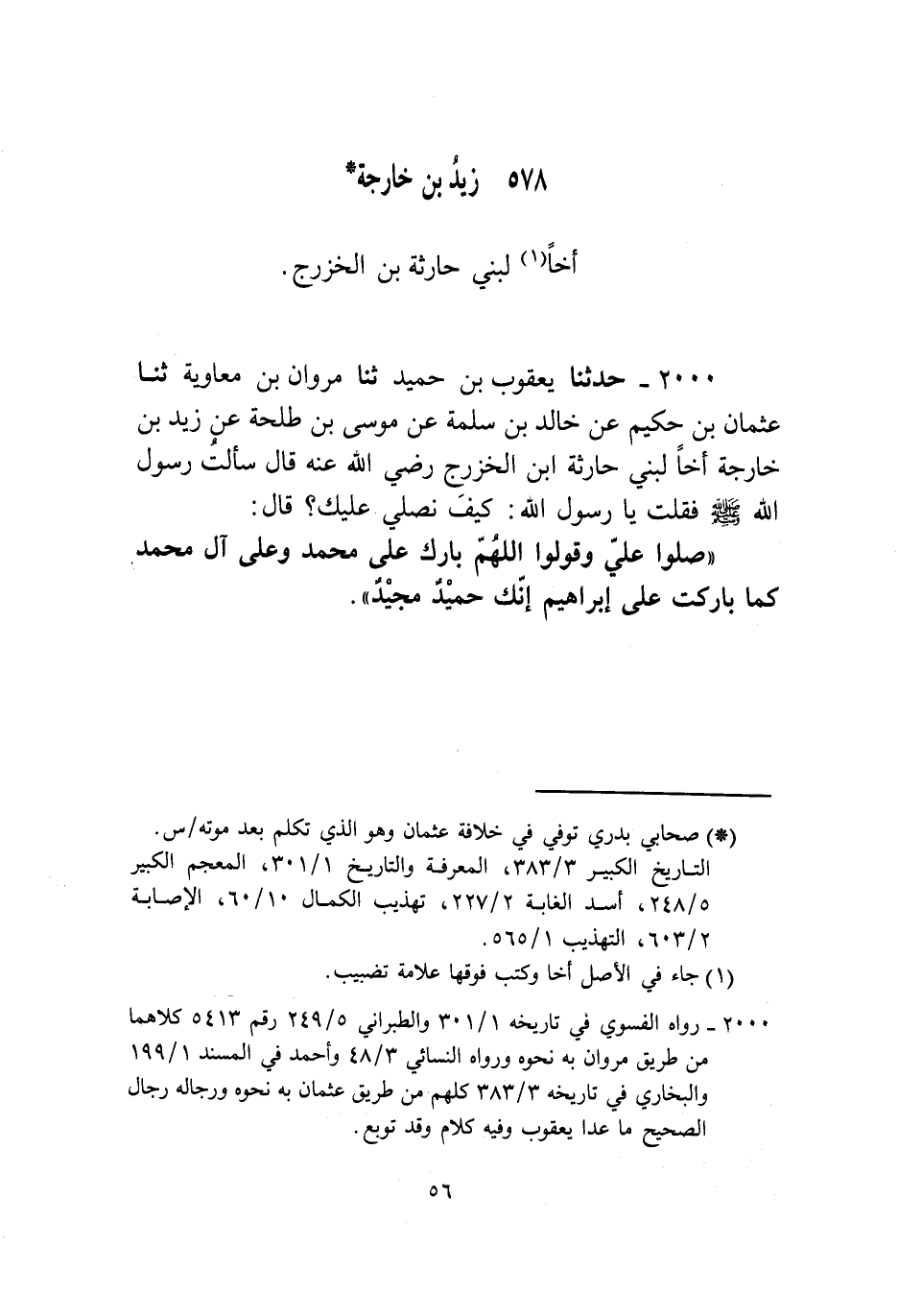 2000 - حَدَّثَنَا يَعْقُوبُ بْنُ حُمَيْدٍ، ثنا مَرْوَانُ بْنُ مُعَاوِيَةَ، ثنا عُثْمَانُ بْنُ حَكِيمٍ، عَنْ خَالِدِ بْنِ سَلَمَةَ، عَنْ مُوسَى بْنِ طَلْحَةَ، عَنْ زَيْدِ بْنِ خَارِجَةَ، أَخٍ لِبَنِي حَارِثَةَ بْنِ الْخَزْرَجِ رَضِيَ اللَّهُ عَنْهُ قَالَ: سَأَلْتُ رَسُولَ اللَّهِ صَلَّى اللهُ عَلَيْهِ وَسَلَّمَ فَقُلْتُ: يَا رَسُولَ اللَّهِ كَيْفَ نُصَلِّي عَلَيْكَ؟ قَالَ: «§صَلُّوا عَلَيَّ وَقُولُوا اللَّهُمَّ بَارِكْ عَلَى مُحَمَّدٍ وَعَلَى آلِ مُحَمَّدٍ كَمَا بَارَكْتَ عَلَى إِبْرَاهِيمَ إِنَّكَ حَمِيدٌ مَجِيدٌ»