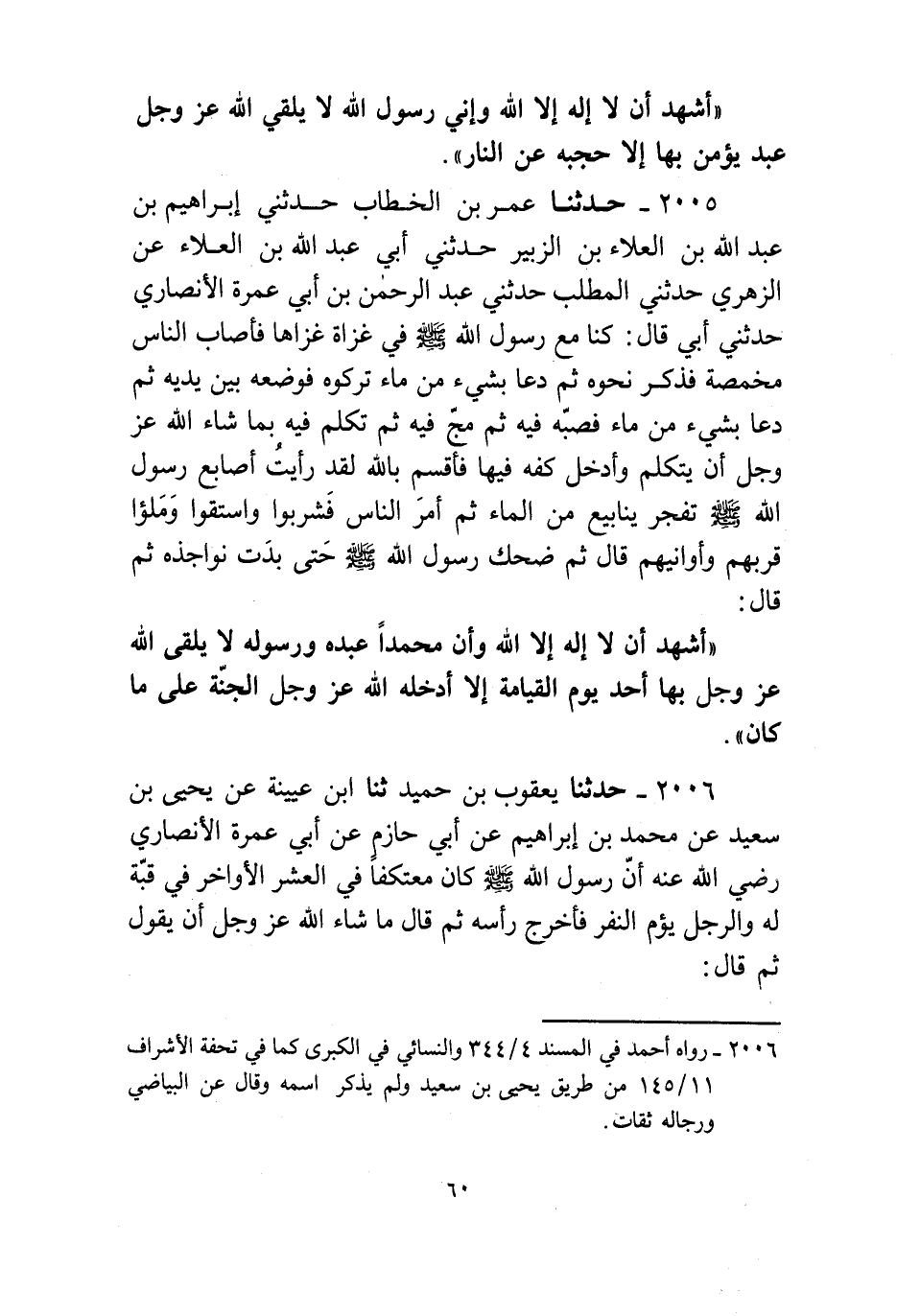 2005 - حَدَّثَنَا عُمَرُ بْنُ الْخَطَّابِ، حَدَّثَنِي إِبْرَاهِيمُ بْنُ عَبْدِ اللَّهِ بْنِ الْعَلَاءِ بْنِ الزُّبَيْرِ، حَدَّثَنِي أَبِي عَبْدُ اللَّهِ بْنُ الْعَلَاءِ، عَنِ الزُّهْرِيِّ، حَدَّثَنِي الْمُطَّلِبُ، حَدَّثَنِي عَبْدُ الرَّحْمَنِ بْنُ أَبِي عَمْرَةَ الْأَنْصَارِيُّ، حَدَّثَنِي أَبِي قَالَ: " §كُنَّا مَعَ رَسُولِ اللَّهِ صَلَّى اللهُ عَلَيْهِ وَسَلَّمَ فِي غَزَاةٍ غَزَاهَا فَأَصَابَ النَّاسَ مَخْمَصَةٌ فَذَكَرَ نَحْوَهُ. ثُمَّ دَعَا بِشَيْءٍ مِنْ مَاءٍ تَرَكُوهُ فَوَضَعَهُ بَيْنَ يَدَيْهِ، ثُمَّ دَعَا بِشَيْءٍ مِنْ مَاءٍ فَصَبَّهُ فِيهِ ثُمَّ مَجَّ فِيهِ ثُمَّ تَكَلَّمَ فِيهِ بِمَا شَاءَ اللَّهُ عَزَّ وَجَلَّ أَنْ يَتَكَلَّمَ وَأَدْخَلَ كَفَّهُ فِيهَا، فَأَقْسَمَ بِاللَّهِ لَقَدْ رَأَيْتُ أَصَابِعَ رَسُولِ اللَّهِ صَلَّى اللهُ عَلَيْهِ وَسَلَّمَ تَفَجَّرُ يَنَابِيعَ مِنَ الْمَاءِ ثُمَّ أَمْرَ النَّاسَ فَشَرِبُوا وَاسْتَقَوْا وَمَلَؤوا قِرَبَهُمْ وَأَوَانِيهِمْ قَالَ: ثُمَّ ضَحِكَ رَسُولُ اللَّهِ صَلَّى اللهُ عَلَيْهِ وَسَلَّمَ حَتَّى بَدَتْ نَوَاجِذُهُ ثُمَّ قَالَ: «أَشْهَدُ أَنْ لَا إِلَهَ إِلَّا اللَّهُ وَأَنَّ مُحَمَّدًا عَبْدُهُ وَرَسُولُهُ لَا يَلْقَى اللَّهَ عَزَّ وَجَلَّ بِهَا أَحَدٌ يَوْمَ الْقِيَامَةِ إِلَّا أَدْخَلَهُ اللَّهُ عَزَّ وَجَلَّ الْجَنَّةَ عَلَى مَا كَانَ»