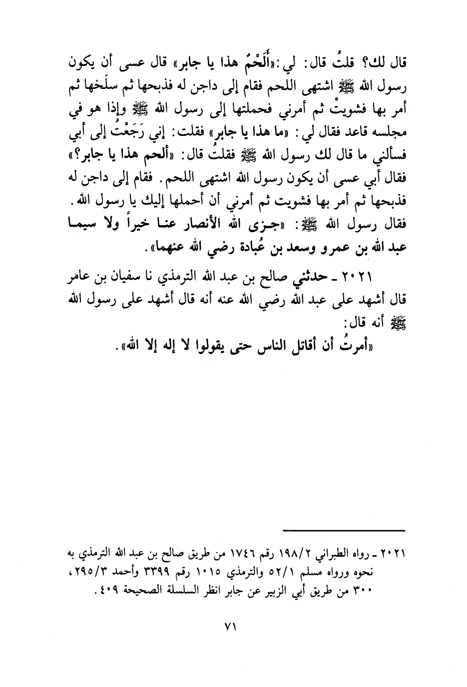 2021 - حَدَّثَنِي صَالِحُ بْنُ عَبْدِ اللَّهِ التِّرْمِذِيُّ، نا سُفْيَانُ بْنُ عَامِرٍ، قَالَ: أَشْهَدُ عَلَى عَبْدِ اللَّهِ رَضِيَ اللَّهُ عَنْهُ أَنَّهُ قَالَ: " أَشْهَدُ عَلَى رَسُولِ اللَّهِ صَلَّى اللهُ عَلَيْهِ وَسَلَّمَ أَنَّهُ قَالَ: «§أُمِرْتُ أَنْ أُقَاتِلَ النَّاسَ حَتَّى يَقُولُوا لَا إِلَهَ إِلَّا اللَّهُ»
