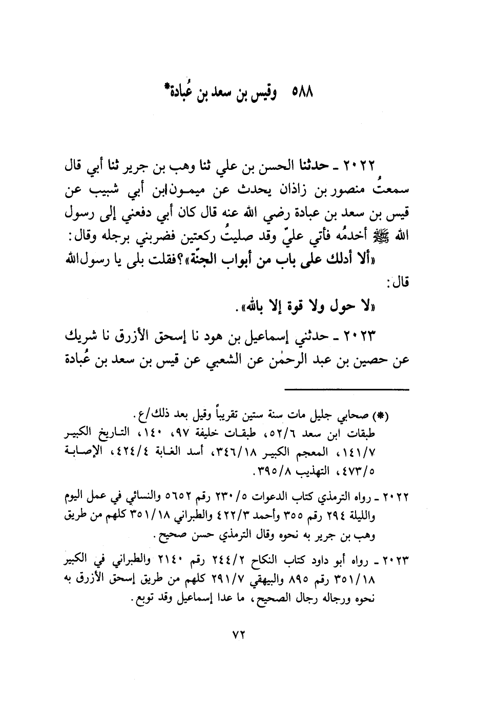 2022 - حَدَّثَنَا الْحَسَنُ بْنُ عَلَيٍّ، ثنا وَهْبُ بْنُ جَرِيرٍ، ثنا أَبِي قَالَ: سَمِعْتُ مَنْصُورَ بْنَ زَاذَانَ، يُحَدِّثُ عَنْ مَيْمُونِ بْنِ أَبِي شَبِيبٍ، عَنْ قَيْسِ بْنِ سَعْدِ بْنِ عُبَادَةَ، رَضِيَ اللَّهُ عَنْهُ قَالَ: كَانَ أَبِي دَفَعَنِي إِلَى رَسُولِ اللَّهِ صَلَّى اللهُ عَلَيْهِ وَسَلَّمَ أَخْدُمَهُ فَأَتَى عَلَيَّ وَقَدْ صَلَّيْتُ رَكْعَتَيْنِ فَضَرَبَنِي بِرِجْلِهِ وَقَالَ: «§أَلَا أَدُلُّكَ عَلَى بَابٍ مِنْ أَبْوَابِ الْجَنَّةِ؟» فَقُلْتُ: بَلَى يَا رَسُولَ اللَّهِ قَالَ: «لَا حَوْلَ وَلَا قُوَّةَ إِلَّا بِاللَّهِ»