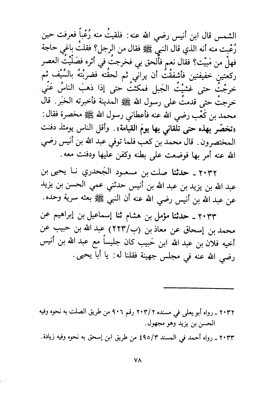 2033 - حَدَّثَنَا مُؤَمَّلُ بْنُ هِشَامٍ، ثنا إِسْمَاعِيلُ بْنُ إِبْرَاهِيمَ، عَنْ مُحَمَّدِ بْنِ إِسْحَاقَ، عَنْ مُعَاذِ بْنِ عَبْدِ اللَّهِ بْنِ حَبِيبٍ، عَنْ أَخِيهِ، فُلَانِ بْنِ عَبْدِ اللَّهِ بْنِ حَبِيبٍ " كَانَ §جَلِيسًا مَعَ عَبْدِ اللَّهِ بْنِ أُنَيْسٍ رَضِيَ اللَّهُ عَنْهُ فِي مَجْلِسِ جُهَيْنَةَ فَقُلْنَا لَهُ: يَا أَبَا يَحْيَى " وَمِمَّا أَسْنَدَ: