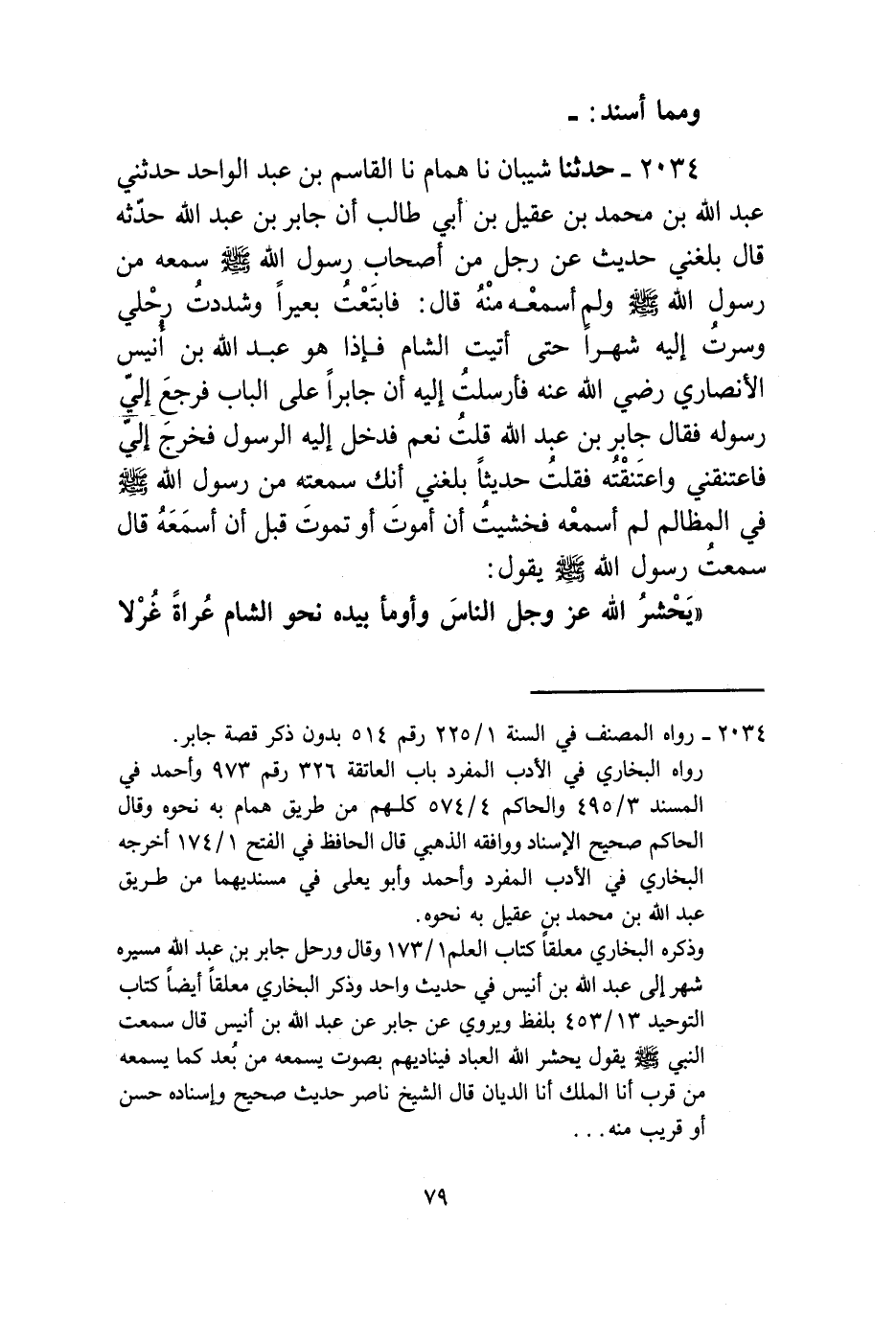 2034 - حَدَّثَنَا شَيْبَانُ، نا هَمَّامٌ، نا الْقَاسِمُ بْنُ عَبْدِ الْوَاحِدِ، حَدَّثَنِي عَبْدُ اللَّهِ بْنُ مُحَمَّدِ بْنِ عَقِيلِ بْنِ أَبِي طَالِبٍ، أَنَّ جَابِرَ بْنَ عَبْدِ اللَّهِ، حَدَّثَهُ قَالَ: " بَلَغَنِي حَدِيثٌ عَنْ رَجُلٍ مِنْ أَصْحَابِ رَسُولِ اللَّهِ صَلَّى اللهُ عَلَيْهِ وَسَلَّمَ سَمِعَهُ مِنْ رَسُولِ اللَّهِ صَلَّى اللهُ عَلَيْهِ وَسَلَّمَ وَلَمْ أَسْمَعْهُ مِنْهُ قَالَ: فَابْتَعْتُ بَعِيرًا وَشَدَدْتُ رَحْلِي وَسِرْتُ إِلَيْهِ شَهْرًا حَتَّى أَتَيْتُ الشَّامَ فَإِذَا هُوَ عَبْدُ اللَّهِ بْنُ أُنَيْسٍ الْأَنْصَارِيُّ رَضِيَ اللَّهُ عَنْهُ فَأَرْسَلَتُ إِلَيْهِ أَنَّ جَابِرًا عَلَى الْبَابِ فَرَجَعَ إِلَيَّ رَسُولُهُ فَقَالَ جَابِرُ بْنُ عَبْدِ اللَّهِ: قُلْتُ: نَعَمْ فَدَخَلَ إِلَيْهِ الرَّسُولُ فَخَرَجَ إِلَيَّ فَاعْتَنَقَنِي وَاعْتَنَقْتُهُ فَقُلْتُ: حَدِيثًا بَلَغَنِي أَنَّكَ سَمِعَتَهُ مِنْ رَسُولِ اللَّهِ صَلَّى اللهُ عَلَيْهِ وَسَلَّمَ فِي الْمَظَالِمِ لَمْ أَسْمَعْهُ فَخَشِيتُ أَنْ أَمُوتَ أَوْ تَمُوتَ قَبْلَ أَنْ أَسْمَعَهُ قَالَ: سَمِعْتُ رَسُولَ اللَّهِ صَلَّى اللهُ عَلَيْهِ وَسَلَّمَ يَقُولُ: «§يَحْشُرُ اللَّهُ عَزَّ وَجَلَّ النَّاسَ وَأَوْمَأَ بِيَدِهِ نَحْوَ الشَّامِ عُرَاةً غُرْلًا بُهْمًا» قُلْتُ: مَا بُهْمًا؟ قَالَ: لَيْسَ مَعَهُمْ شَيْءٌ فَيُنَادِي بِصَوْتٍ يَسْمَعُهُ مَنْ بَعُدَكَمَا يَسْمَعُهُ مَنْ قَرُبَ أَنَا الْمَلِكُ أَنَا الدَّيَّانُ لَا يَنْبَغِي لِأَحَدٍ مِنْ أَهْلِ الْجَنَّةِ أَنْ يَدْخُلَ الْجَنَّةَ وَأَحَدٌ مِنْ أَهْلِ النَّارِ يُطَالِبُهُ بِمَظْلِمَةٍ حَتَّى اللَّطْمَةِ " قِيلَ: وَكَيْفَ وَإِنَّا نَأْتِي اللَّهَ عَزَّ وَجَلَّ عُرَاةً غُرْلًا بُهْمًا قَالَ: «بِالْحَسَنَاتِ وَالسَّيِّئَاتِ»