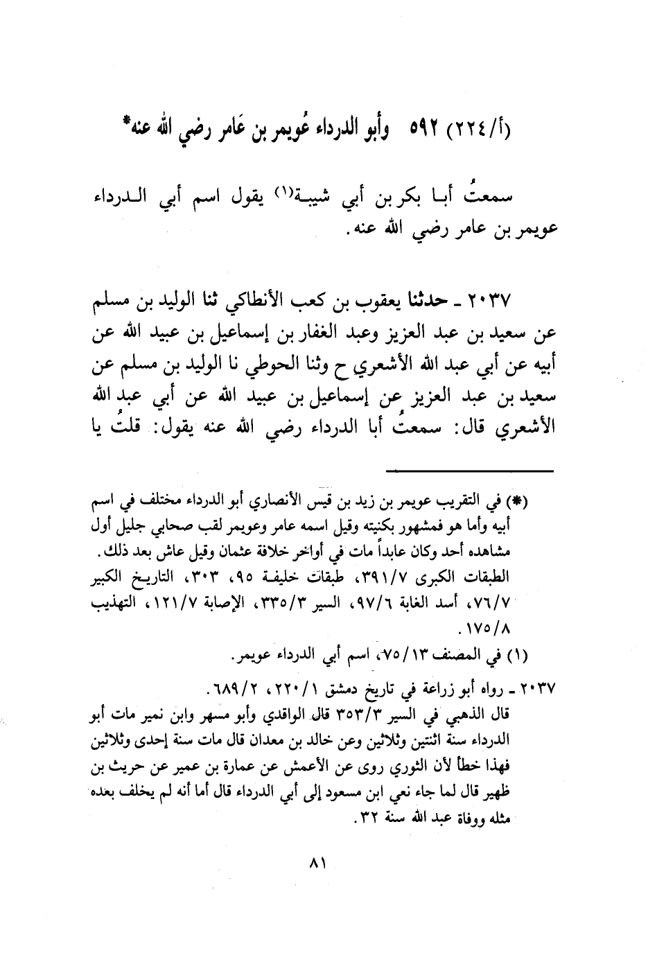 §وَأَبُو الدَّرْدَاءِ عُوَيْمِرُ بْنُ عَامِرٍ رَضِيَ اللَّهُ عَنْهُ. سَمِعْتُ أَبَا بَكْرِ بْنَ أَبِي شَيْبَةَ يَقُولُ: اسْمُ أَبِي الدَّرْدَاءِ عُوَيْمِرُ بْنُ عَامِرٍ رَضِيَ اللَّهُ عَنْهُ.